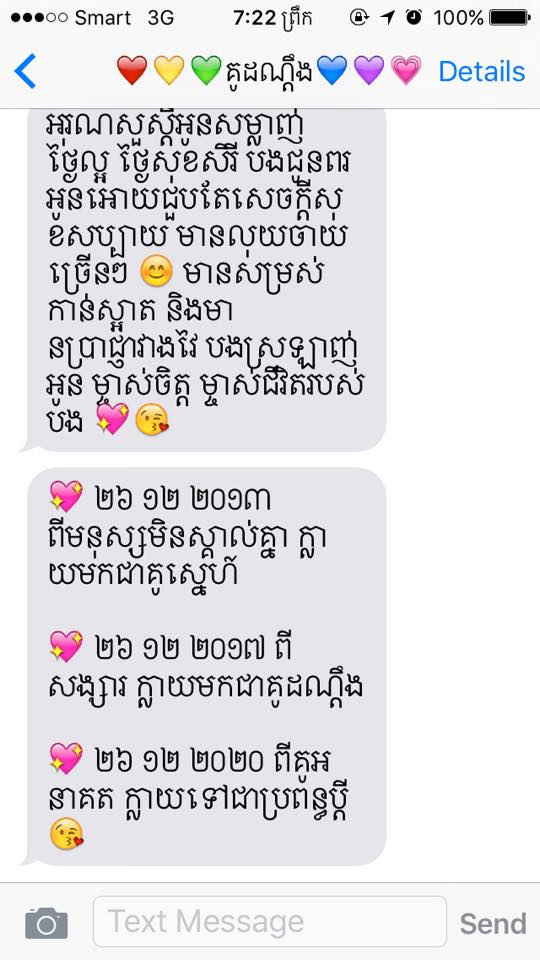 រំលឹកដល់ថ្ងៃនេះ កាលពី៤ឆ្នាំមុន ថ្ងៃដែលទើបតែស្រឡាញ់គ្នាដំបូង គឺពួកយើងចាប់ផ្តើមដោយ គ្មានក្តីសង្ឃឹមសោះថានឹងមកដល់ថ្ងៃនេះ? ព្រោះពួកយើងនៅ ឋានៈខុសគ្នាណាស់ បងជាគ្រូ បងមានអាយុច្រើនជាងអូន។ ចំណែកអូន ជាសិស្សដែលនិយាយច្រើន ជេ អឹម? ហើយ អាឡិក អាឡក់ គ្មានដឹងខ្យល់សោះ មិនគួរណា បងគ្រូស្រឡាញ់អូនសោះ?។ ផ្តើមដំបូង ពួកយើងមានការភ័យខ្លាច? ខ្លាចគេដឹង មិនហ៊ានផុសរូបជាមួយគ្នាទេ ពេលខ្លះអូនក៏អន់ចិត្តដែរ បងមិនង្ហាញប្រាប់អ្នកដទៃថាពួកយើងគឺជាសង្សា នឹងគ្នា បុ៉ន្តែយូរៗទៅការភ័យខ្លាច ក៏រំសាយបន្តិចម្តង ដោយក្តីស្រឡាញ់ដែលមានលើចំណងស្នែហ៍មួយនេះ។ រហូតមកដល់ថ្ងៃ ២១ ខែធ្នូ ឆ្នាំ២០១៧នេះ បងក៏បានបង្ហាញ ប្រាប់មនុស្សគ្រប់គ្នាថា បងស្រឡាញ់អូន បងមិនមែនជាសង្សា តែបងជា គូដណ្តឹង ជា អនាគត ស្វាមីអូន ☺ បងផ្តល់កិត្តិយសដល់អូន និង គ្រួសារ ក្នុងនាមជាកូនប្រុស។ អរគុណដែល ស្រឡាញ់អូន អរគុណដែលស្រឡាញ់ ក្មេងស្រី អាឡិកអាឡក់ម្នាក់នេះ កាលពី៤ឆ្នាំមុន ។ អរគុណដែលស្រឡាញ់អូន ក្នុងពេលដែលមនុស្សគ្រប់រូប មើលមិនឃើញ ពីភាពល្អរបស់អូន អរគុណដែលទទួលគ្រប់ អារម្មណ៍របស់អូន ទៅលើបង អរគុណដែលទ្រាំជាមួយ កូនទោលហើយក្បាលរឹងដូចជាអូន។ អូនស្រឡាញ់បង? ស្រឡាញ់បងតែម្នាក់ តាំងពី៤ឆ្នាំមុន មកដល់ថ្ងៃនេះ និង ជារៀងរហូតទៅ។ ហើយចុងក្រោយ ក៏អរគុណដល់ ទឹប្រឹក្សាទាំងអស់ ដែលជួយជ្រោមជ្រែងពួកយើងកន្លងមក???
