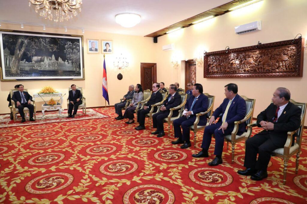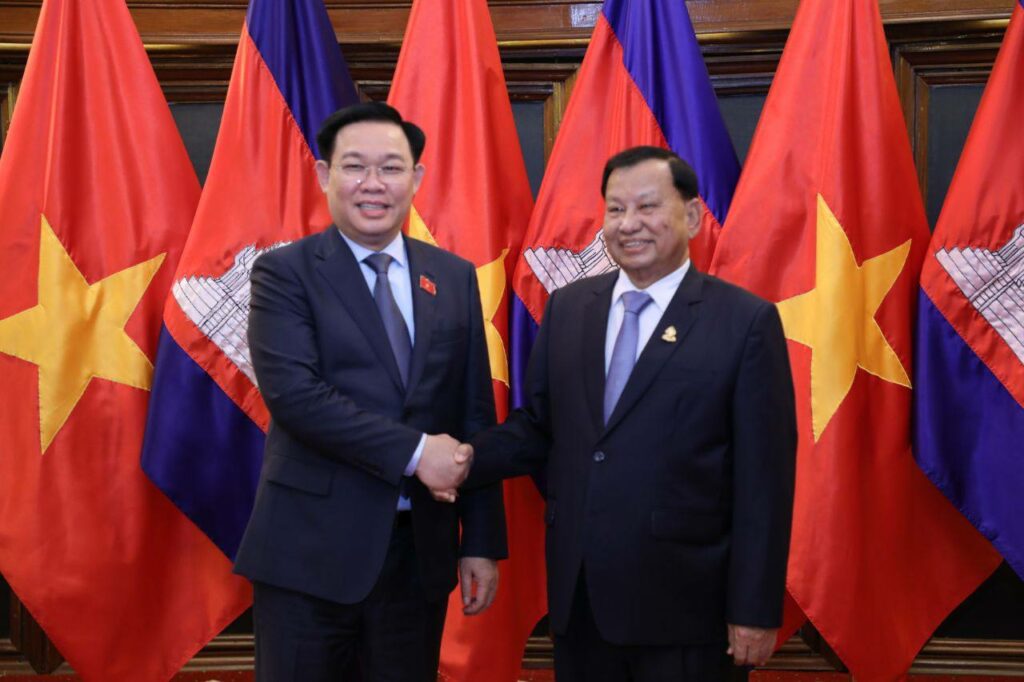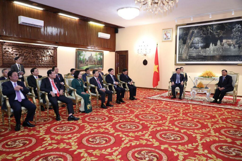 ភ្នំពេញៈ សម្តេចវិបុលសេនាភក្តី សាយ ឈុំ ប្រធានព្រឹទ្ធសភា នៃព្រះរាជាណាចក្រកម្ពុជា បានទទួលជួបឯកឧត្តម វឿង ឌិញហ្វេ (VUONG DINH HUE) ប្រធានរដ្ឋសភា នៃសាធារណរដ្ឋសង្គមនិយមវៀតណាម ក្នុងឱកាសដែលឯកឧត្តមវឿង ឌិញហ្វេ ដឹកនាំគណៈប្រតិភូអញ្ជើញមកបំពេញទស្សនកិច្ចជាផ្លូវការ និងអញ្ជើញចូលរួមមហាសន្និបាត អន្តរសភាអាស៊ានលើកទី៤៣ នៅព្រះរាជាណាចក្រកម្ពុជា នារសៀលថ្ងៃទី១៩ ខែវិច្ឆិកា ឆ្នាំ២០២២ នៅវិមានព្រឹទ្ធសភា