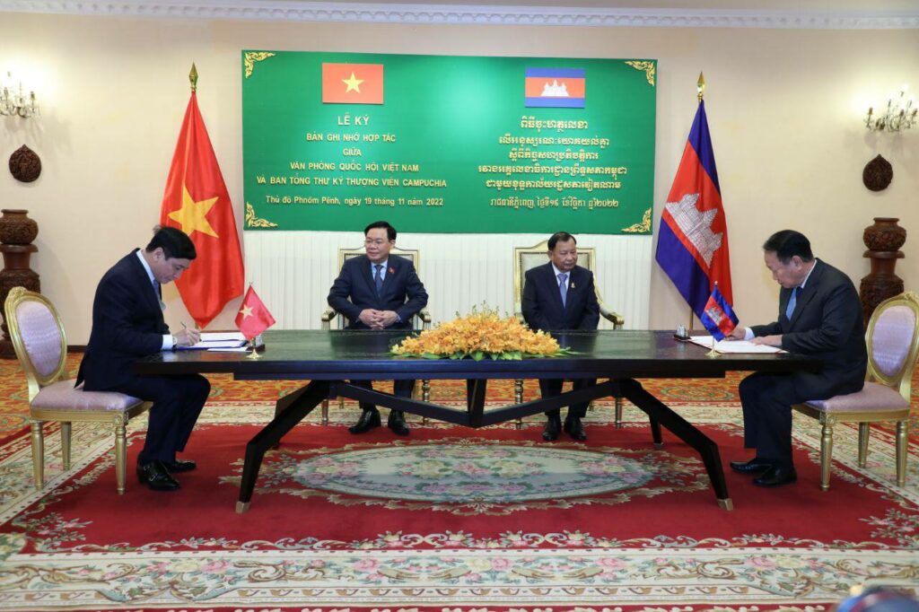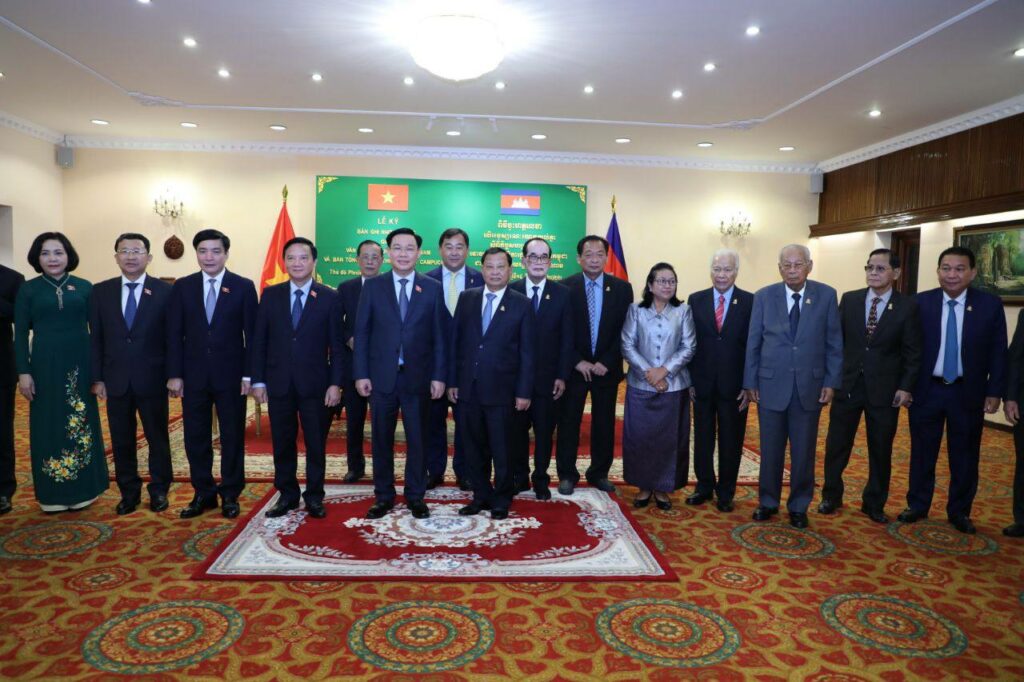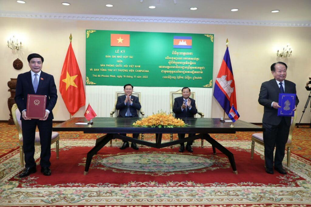 បន្ទាប់មកពីកិច្ចពិភាក្សាទ្វេរភាគីរួចមកសម្តេចវិបុលសេនាភក្តី សាយ ឈុំ ប្រធានព្រឹទ្ធសភា នៃព្រះរាជាណាចក្រកម្ពុជា និងឯកឧត្តម វឿង ឌិញហ្វេ ប្រធានរដ្ឋសភា នៃសាធារណរដ្ឋសង្គមនិយមវៀតណាម បានអញ្ជើញជាអធិបតីក្នុងពិធីចុះហត្ថលេខាលើអនុស្សរណៈ នៃការយោគយល់គ្នារវាងអគ្គលេខាធិការដ្ឋានព្រឹទ្ធសភាកម្ពុជា ជាមួយនឹងខុទ្ធកាល័យរដ្ឋសភាវៀតណាម ដែលចុះហត្ថលេខាដោយឯកឧត្តម អ៊ុំ សារឹទ្ធ អគ្គលេខាធិការព្រឹទ្ធសភាកម្ពុជា និងឯកឧត្តម Bui Van Cuong ប្រធានខុទ្ទកាល័យរដ្ឋសភាវៀតណាម។