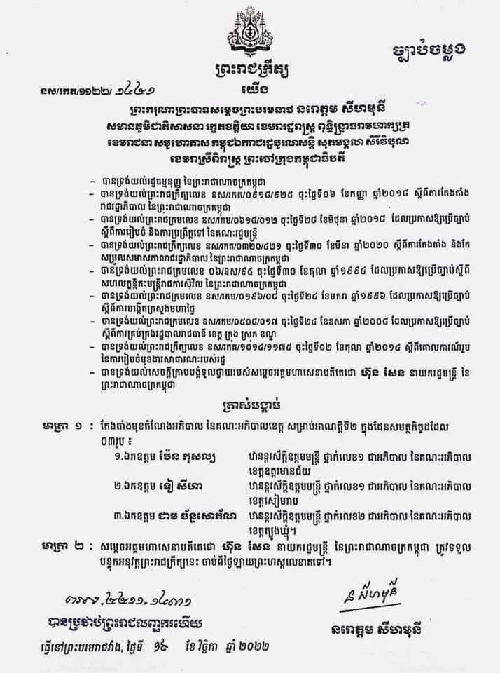 ភ្នំពេញ ៖ ព្រះករុណាព្រះបាទសម្ដេចព្រះបរមនាថ នរោត្ដម សីហមុនី ត្រាស់បង្គាប់តែងតាំងមុខតំណែងអភិបាល នៃគណៈអភិបាលខេត្ត សម្រាប់អាណត្តិទី២ ក្នុងដែនសមត្ថកិច្ចដដែល ០៣រូប ៖