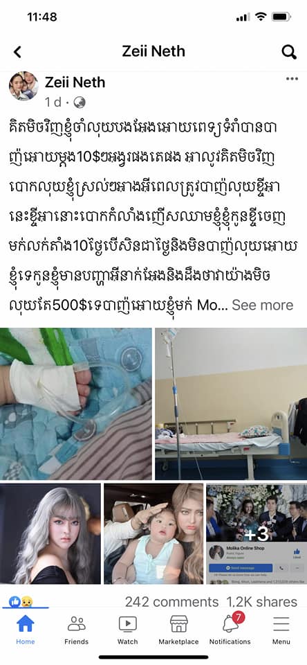 នេះបើតាមម្ចាស់លុយដែលមានគណនីហ្វេសប៊ុកឈ្មោះថា Zeii Neth បានរៀបរាប់ឲ្យដឹងបែបនេះថា «គិតមិចវិញខ្ញុំចាំលុយបងឯងឣោយពេទ្យ ទម្រាំបានបាញ់ឣោយម្តង10$ៗ ឣង្វរផងតេផង ឣាលូវគិតមិចវិញបោកលុយខ្ញុំស្រល់ៗ ឣាងអីពេលត្រូវបាញ់លុយ ខ្ចីឣានេះខ្ចីឣានោះ បោកកំលាំងញើសឈាមខ្ញុំ ខ្ញុំកូនខ្ចីចេញមកលក់តាំង10ថ្ងៃ បើសិនជាថ្ងៃហ្នឹងមិនបាញ់លុយឣោយខ្ញុំទេ កូនខ្ញុំមានបញ្ហាអី អ្នកឯងនឹងដឹងថាវាយ៉ាងមិច លុយតែ 500$ ទេ បាញ់ឣោយខ្ញុំមក Mo Lika កូនខ្ញុំរលាកសួតចេញពីពេទ្យមួយចូលពេទ្យមួយ ហើយកូនខ្ញុំទើប3ខែ កូនខ្ញុំឈឺតាំងពី1ខែរហូតដល់កូនខ្ញុំ3ខែ ខ្ញុំចាំលុយគាត់រាល់ថ្ងៃទារទំរាំបាន10$ៗ ចាំគាត់បាញ់ឣោយ និងតេផងឆាតផង ចាំដល់ម៉ោង11 យប់ សឹងរាល់ថ្ងៃ ទម្រាំគាត់បាញ់ឣោយខ្ញុំឡើងទាស់សសៃកូនខ្ចីហើយ លុយខ្ញុំតែ500$ បាញ់ឣោយខ្ញុំទាំងឣស់មក…»។