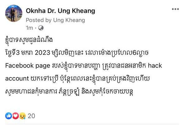 ពិតណាស់ នៅមុននេះបន្តិច (ថ្ងៃទី៤ ខែមករា ឆ្នាំ២០២២) លោកឧកញ៉ា អ៊ឹង ឃាង បានបង្ហោះសារបញ្ជាក់យ៉ាងដូច្នេះថា៖ «ខ្ញុំបាទសូមជូនដំណឹង ថ្ងៃទី3 មករា 2023 ម្សិលមិញនេះ វេលាម៉ោងប្រហែល6ល្ងាច Facebook page របស់ខ្ញុំបាទមានបញ្ហា ត្រូវបានជនអនាមិក hack account យកទៅប្រើ ប៉ុន្តែពេលនេះខ្ញុំបានគ្រប់គ្រងវិញហើយ សូមមហាជនកុំមានការ ភ័ន្តច្រឡំ និងសូមកុំចែកចាយបន្ត»៕ រក្សាសិទ្ធិដោយ៖ លឹម ហុង