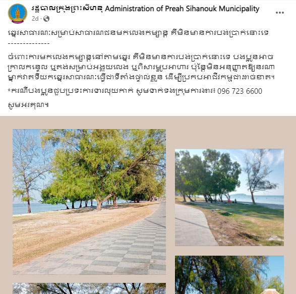 ថ្មីៗនេះ អ្នកប្រើប្រាស់បណ្តាញសង្គមហ្វេសប៊ុក ពិតជាមានការចាប់អារម្មណ៍ជាខ្លាំង ខណៈបានឃើញរដ្ឋបាលក្រុងព្រះសីហនុ បានចេញសេចក្តីជូនដំណឹងឲ្យសាធាធារណជនបានដឹងថា បងប្អូនដែលមកលេងកម្សាន្តនៅតាមឆ្នេរសមុទ្រ ពុំមានការបង់ប្រាក់នោះទេ ពោលគឺអាចក្រាលកន្ទេល ឬបោះតង់ អង្គុយពិសារម្ហូបអាហារយ៉ាងរីករាយ ជៀសវាងកុំឲ្យតែបោះសំរាមចោលពាសវាលពាសកាលទៅបានហើយ។