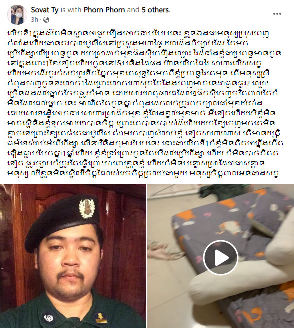 នេះបើតាមស្រ្តីជាប្រពន្ធ ដែលមានគណនីហ្វេសប៊ុកឈ្មោះ Sovat Ty បង្ហោះវីដេអូ និងរូបភាពក្រោយរងអំពើហិង្សាដ៏សាហាវពីប្តីចិត្តកំណាចរូបនោះ ដោយរៀបរាប់ទាំងក្តីឈឺចាប់ខ្លាំងបំផុតថា៖ «លើកទី1ក្នុងជីវិតមិនស្មានថាជួបរឿងថោកទាបបែបនេះ ខ្លួនឯងជាមនុស្សប្រុសពេញកំលាំងហើយជានគរបាលប៉ូលីស យល់ដឹងពីច្បាប់ដែរ តែមកប្រើហឹង្សាលើប្រពន្ធកូន យកស្រាដាក់មុខផឹងស៊ីរករឿងឈ្លោះ វៃដំទាំងខ្ញុំជាប្រពន្ធមានកូននៅក្នុងពោះ1ខែទៀត ហើយកូននៅឱបនិងដៃផង ហ៊ានលើកដៃវៃ សាហាវលើសសត្វ ហើយមកដើរតួរកំសត់ហូរទឹកភ្នែកមុខគេ សុទ្ធតែមកពីខ្ញុំប្រពន្ធវៃគេមុន តើមនុស្សស្រីកំពុងចាញ់កូនទះលោក1ដៃព្រោះលោកហៅសុតតែងែងពេញមាត់នេះវាធ្ងន់ធ្ងរ?»។
