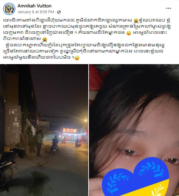 នេះបើយោងតាមស្រីស្អាតដែលមានគណនីហ្វេសប៊ុកឈ្មោះ Amnikah Vuitton បានបង្ហោះសារជាការដាស់តឿន ទៅដល់ស្រីៗដូចគ្នាឲ្យដឹងថា៖ «ចោរជិះតាមតាំងពីផ្សារដីហ៊ុយមកដល់ ភូមិដំណាក់ជិតផ្សារឈូកមាស ខ្ញុំឈប់វាឈប់ ខ្ញុំទៅមុខវាទៅមុខដែរ ខ្លាចពេកឈប់មុខផ្ទះគេឲ្យគេជួយ សំណាងគ្រាន់ស្រែកហៅម្ចាស់ផ្ទះឲ្យចេញមកវា ជិះចេញទៅវិញយ៉ាងលឿន។ ភ័យណាស់ជិះតែម្នាក់ផង អារម្មណ៍ពេលនោះពិបាកពណ៌នាណាស់។