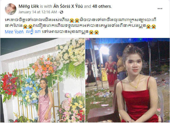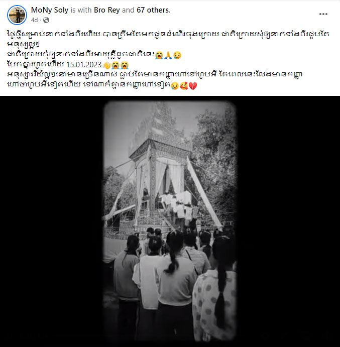 ប្រភពពីគណនីហ្វេសប៊ុក MoNy Soly ត្រូវជាមិត្តភ័ក្ដិបានសរសេររៀបរាប់ទាំងក្តីសោកសៅថា៖«ថ្ងៃថ្មីសម្រាប់អ្នកទាំងពីរហើយ បានត្រឹមតែមកជូនដំណើរចុងក្រោយ ជាតិក្រោយសុំឲ្យអ្នកទាំងពីរជួបតែមនុស្សល្អៗ ជាតិក្រោយកុំឲ្យអ្នកទាំងពីរអាយុខ្លីដូចជាតិនេះ បែកគ្នារហូតហើយ 15.01.2023 អនុស្សាវរីយ៍ល្អៗនៅមានច្រើនណាស់ ធ្លាប់តែមានកញ្ញាហៅទៅហូបអី តែពេលនេះលែងមានកញ្ញាហៅថាហូបអីទៀតហើយ ទៅណាក៏គ្មានកញ្ញាហៅទៀត»។