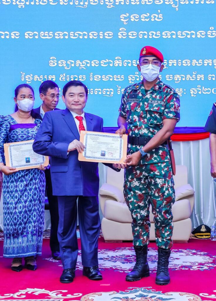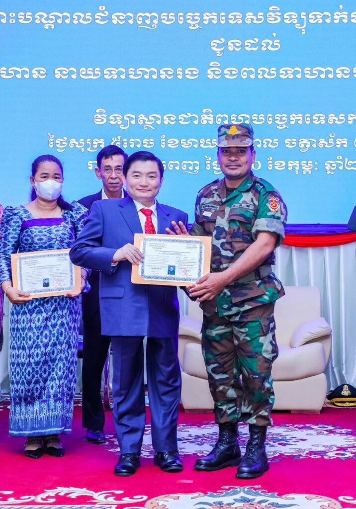 ភ្នំពេញ ៖ ថ្លែងក្នុងពិធីប្រគល់វិញ្ញាបនបត្របញ្ចប់វគ្គបណ្តុះបណ្តាលជំនាញវិទ្យុទាក់ទង និងដំឡើងប្រព័ន្ធអង់តែន ជូនដល់នាយទាហាន នាយទាហានរង និងពលទាហានចំណុះកងទ័ពជើងគោក នាព្រឹកថ្ងៃទី១០ ខែកុម្ភៈ ឆ្នាំ២០២៣ នៅវិទ្យាស្ថានជាតិពហុបច្ចេកទេសកម្ពុជា លោក ហេង សួរ រដ្ឋលេខាធិការក្រសួងការងារ និងបណ្តុះបណ្តាលវិជ្ជាជីវៈ ជឿជាក់ថា សិក្ខាកាមដែលបានមកទទួលការបណ្តុះបណ្តាលនេះ ពិតជាបានទទួលនូវចំណេះដឹងថ្មីបន្ថែម និងចំណេះធ្វើមួយពិតប្រាកដ និងជាក់លាក់ លើការងារជំនាញវិទ្យុទាក់ទង និងដំទ្បើងប្រព័ន្ធអង់តែន ដើម្បីយកទៅប្រើប្រាស់ជាប្រយោជន៍រួមក្នុងការបំពេញតួនាទី ក៏ដូចជាចែករំលែកនូវចំណេះដឹង និងជំនាញទាំងនេះ ជាមួយសហការីនៅតាមមូលដ្ឋានកងទ័ពរបស់ខ្លួន។
