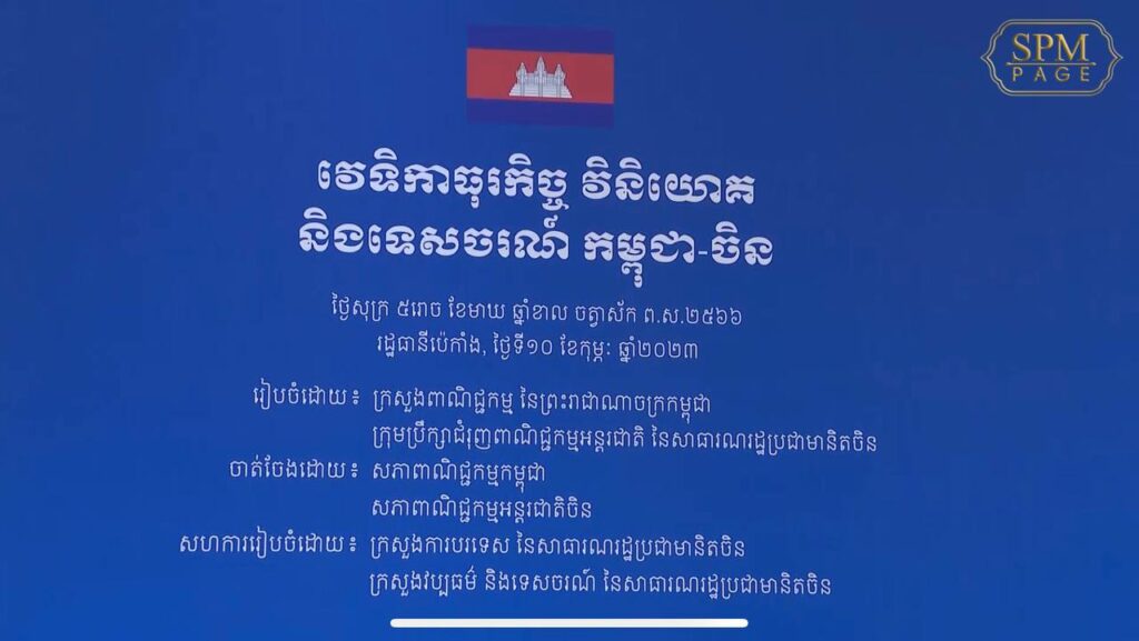 នៅរាត្រីថ្ងៃទី១០កុម្ភៈ ខែកុម្ភៈ ឆ្នាំ២០២៣ នៅសាធារណរដ្ឋប្រជាមានិតចិន សម្តេចអគ្គមហាសេនាបតីតេជោ ហ៊ុន សែន នាយករដ្ឋមន្រ្តី នៃព្រះរាជាណាចក្រកម្ពុជា បានអញ្ជើញជាអធិបតីដ៏ខ្ពង់ខ្ពស់ ក្នុងពិធីបើកវេទិកាធុរកិច្ច វិនិយោគ និងទេសចរណ៍កម្ពុជា-ចិន ដែលរៀបចំឡើងដោយ ក្រសួងពាណិជ្ជកម្ម នៃព្រះរាជាណាចក្រកម្ពុជា ក្រុមប្រឹក្សាជំរុញពាណិជ្ជកម្មអន្តរជាតិ នៃសាធារណរដ្ឋប្រជាមានិតចិន