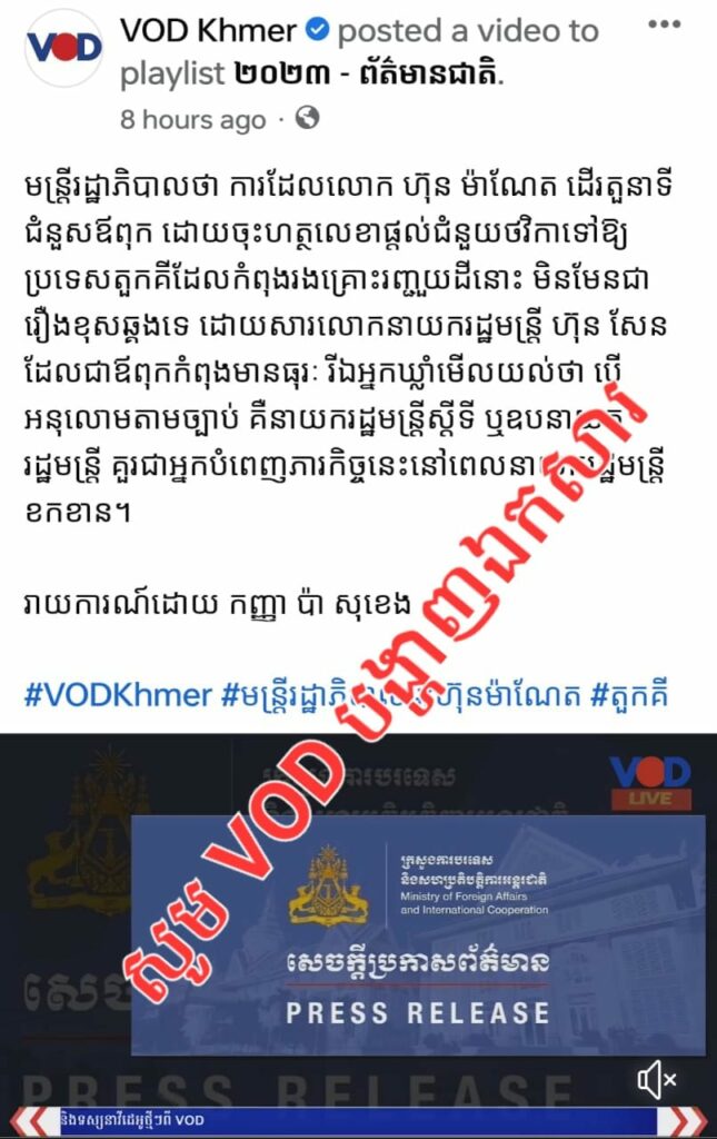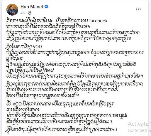 បើ VOD មិនមានឯកសារ ហើយចុះផ្សាយព័ត៌មានមិនត្រឹមត្រូវ សូមធ្វើការសុំទោស ព្រមទាំងធ្វើការកែសម្រួលព័ត៌មាន និងផ្សព្វផ្សាយជាសាធារណៈជាបន្ទាន់ ដើម្បីកុំឲ្យសាធារណៈមតិមានការយល់ច្រឡំក្នុងរឿងនេះ។
