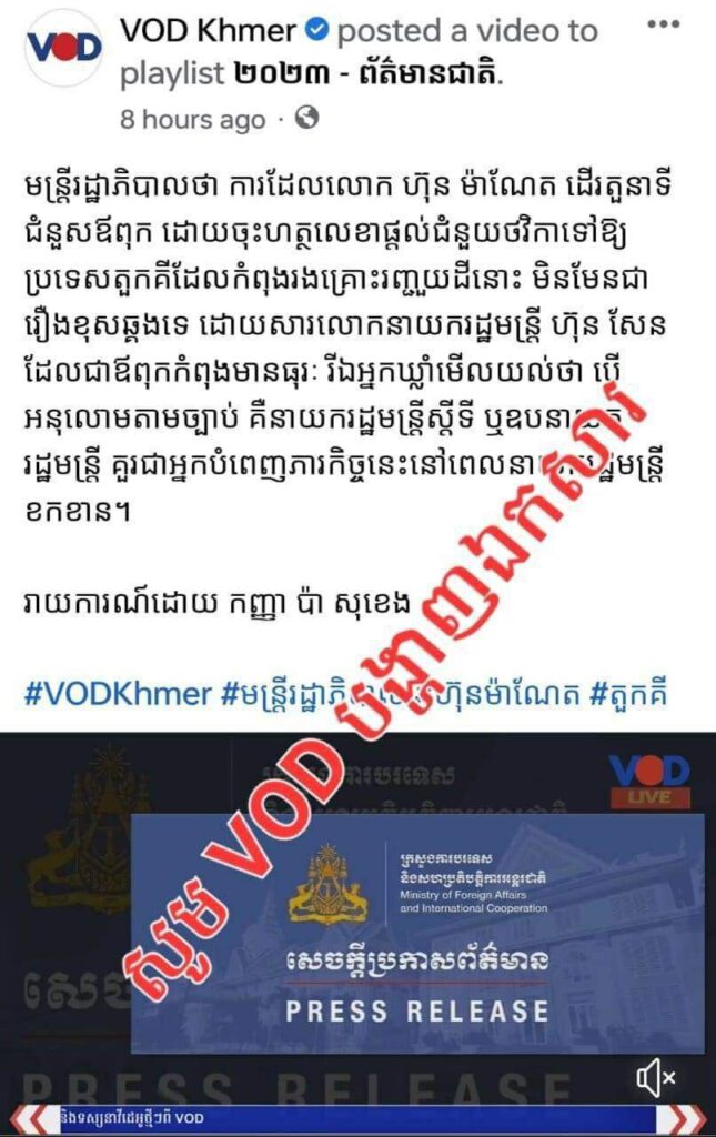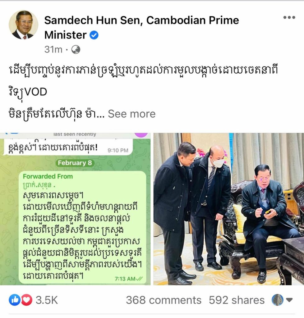 ភ្នំពេញ ៖ សម្តេចតេជោ ហ៊ុន សែន បានសរសេរនៅលើហ្វេសប៊ុកផ្លូវការនៅថ្ងៃទី១១ ខែកុម្ភៈ នេះថា “ដើម្បីបញ្ចប់នូវការភាន់ច្រឡំ ឬរហូតដល់ការមួលបង្កាច់ដោយចេតនាពីវិទ្យុ VOD មិនត្រឹមតែលើ ហ៊ុន ម៉ាណែត ប៉ុណ្ណោះទេ តែវាជារឿងរបស់រាជរដ្ឋាភិបាលទាំងមូល លើការគ្រប់គ្រងថវិកាជាតិ ខ្ញុំសូមចែករំលែកនូវរបៀបគ្រប់គ្រង ថវិកានិយាយជារួម និងនិយាយដោយឡែក លើការផ្តល់ជំនួយចំពោះប្រទេសទួរគី។