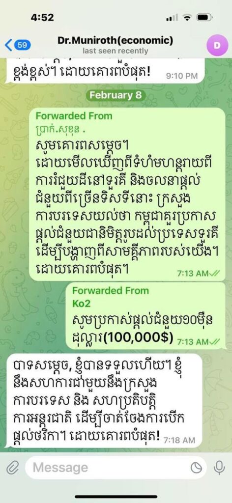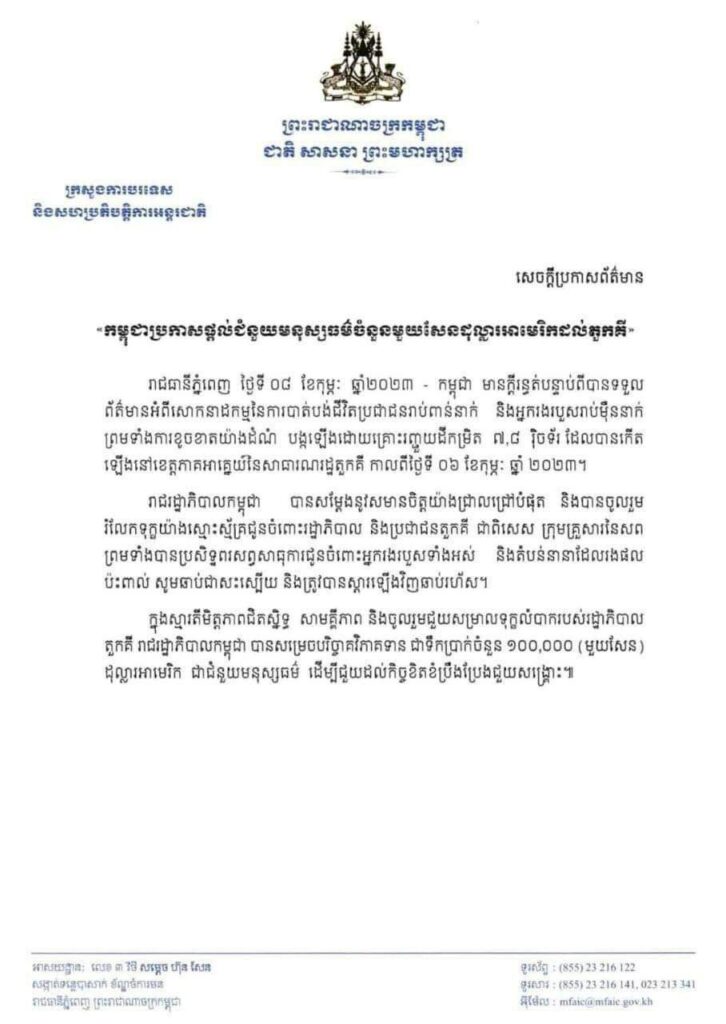សម្តេចតេជោ ហ៊ុន សែន បានបញ្ជាក់ថា “សម្រាប់ជំនួយទៅប្រទេសទួរគីយោបល់ទីមួយ គឺរដ្ឋមន្ត្រីការបរទេស ប្រាក់ សុខុន ព្រឹកថ្ងៃ៨ កុម្ភះ ម៉ោង6.56នាទី។ បញ្ញាខ្ញុំឲ្យប្រកាស់១០ម៉ឺនដុល្លារ ម៉ោង7.12នាទីនិងបញ្ជូនសំណេរទាំងពីរជូនឯកឧត្តម អូន ព័ន្ធមុនីរ័ត្ន ដែលគាត់ឆ្លើយទទួលអនុវត្តនៅម៉ោង 7.18 នៅព្រឹកថ្ងៃ៨កុម្ភៈ២០២៣ដូចគ្នា។ តើការចោទលើ ហ៊ុន ម៉ាណែត ជាការវាយប្រហារខាងនយោបាយ ឬជាការភាន់ច្រឡំ? ខ្ញុំទុកពេលឲ្យសូមទោសជាសាធារណៈរយៈពេល ៧២ម៉ោង ដោយសូមទោសរាជរដ្ឋាភិបាលផង និងសូមទោស ហ៊ុន ម៉ាណែត ផង”។