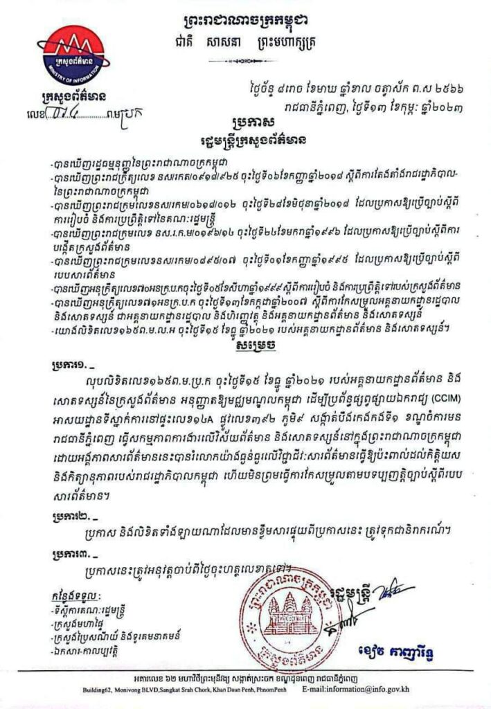 ប្រការ១. លុបលិខិតលេខ១៦៥ព.ម.ប.ក ចុះថ្ងៃទី១៥ ខែធ្នូ ឆ្នាំ២០២១ របស់អគ្គនាយកដ្ឋានព័ត៌មាន និង សោតទស្សន៍នៃក្រសួងព័ត៌មាន អនុញ្ញាតឱ្យមជ្ឈមណ្ឌលកម្ពុជា ដើម្បីប្រព័ន្ធផ្សព្វផ្សាយឯករាជ្យ (CCIM) អាសយដ្ឋានទីស្នាក់ការនៅផ្ទះលេខ១៤ ផ្លូវលេខ៣៩២ ភូមិ៩ សង្កាត់បឹងកេងកងទី១ ខណ្ឌចំការមន រាជធានីភ្នំពេញ ធ្វើសកម្មភាពការងារលើវិស័យព័ត៌មាន និងសោតទស្សន៍នៅក្នុងព្រះរាជាណាចក្រកម្ពុជា ដោយអង្គភាពសារព័ត៌មាននេះបានរំលោភយ៉ាងធ្ងន់ធ្ងរលើវិជ្ជាជីវៈសារព័ត៌មានធ្វើឱ្យប៉ះពាល់ដល់កិត្តិយស និងកិត្យានុភាពរបស់រាជរដ្ឋាភិបាលកម្ពុជា ហើយមិនព្រមធ្វើការកែសម្រួលតាមបទប្បញត្តិច្បាប់ស្តីពីរបប សារព័ត៌មាន។