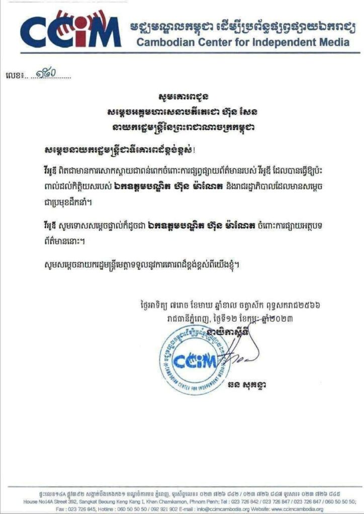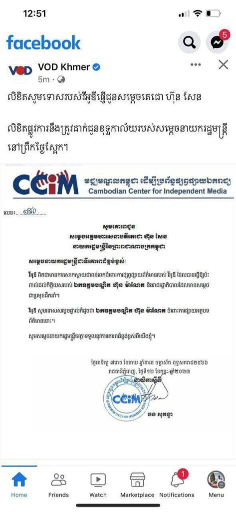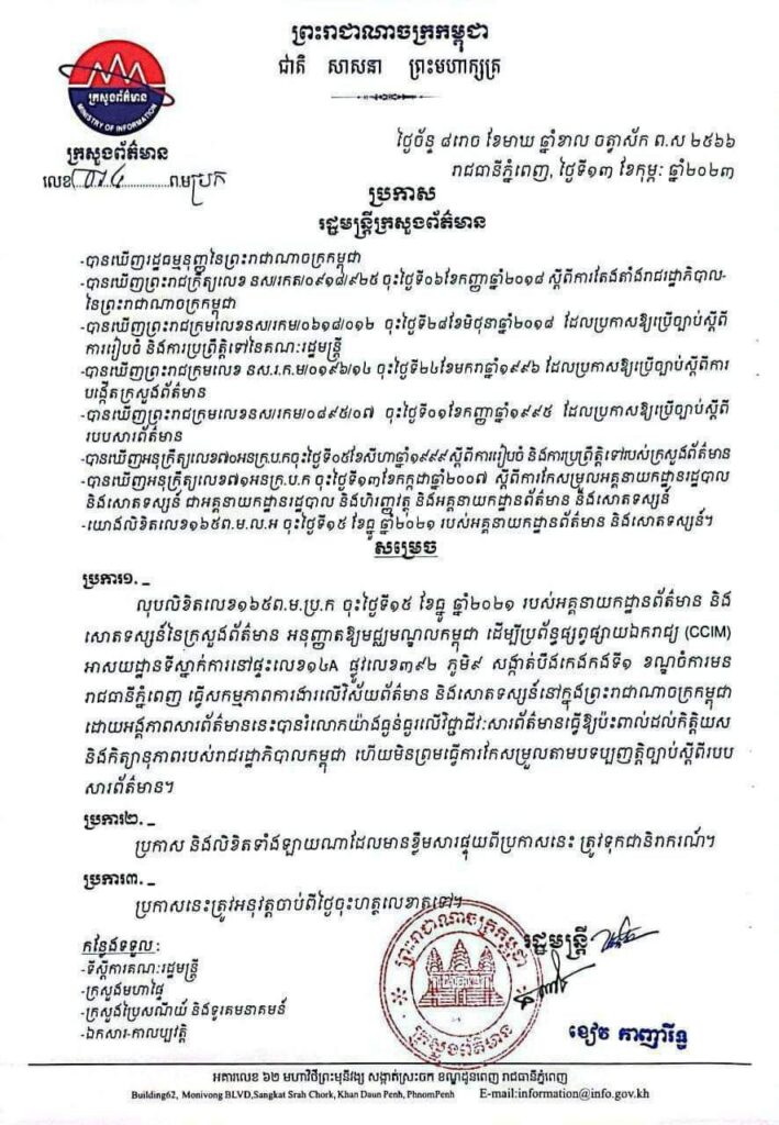 នៅទីបំផុតទៅ ក្រសួងព័ត៌មាន នាថ្ងៃទី១៣ ខែកុម្ភៈ ឆ្នាំ២០២៣ បានចេញប្រកាស លុបអាជ្ញាប័ណ្ណមជ្ឈមណ្ឌលកម្ពុជា ដើម្បីប្រព័ន្ធផ្សព្វផ្សាយឯករាជ្យ (CCIM) ធ្វើសកម្មភាពការងារលើវិស័យព័ត៌មាន និងសោតទស្សន៍នៅក្នុងព្រះរាជាណាចក្រកម្ពុជា ក្នុងនោះមានសារព័ត៌មាន VOD, ចុះហត្ថលេខាដោយ លោក ខៀវ កាញារីទ្ធ រដ្ឋមន្ត្រីក្រសួងព័ត៌មាន។