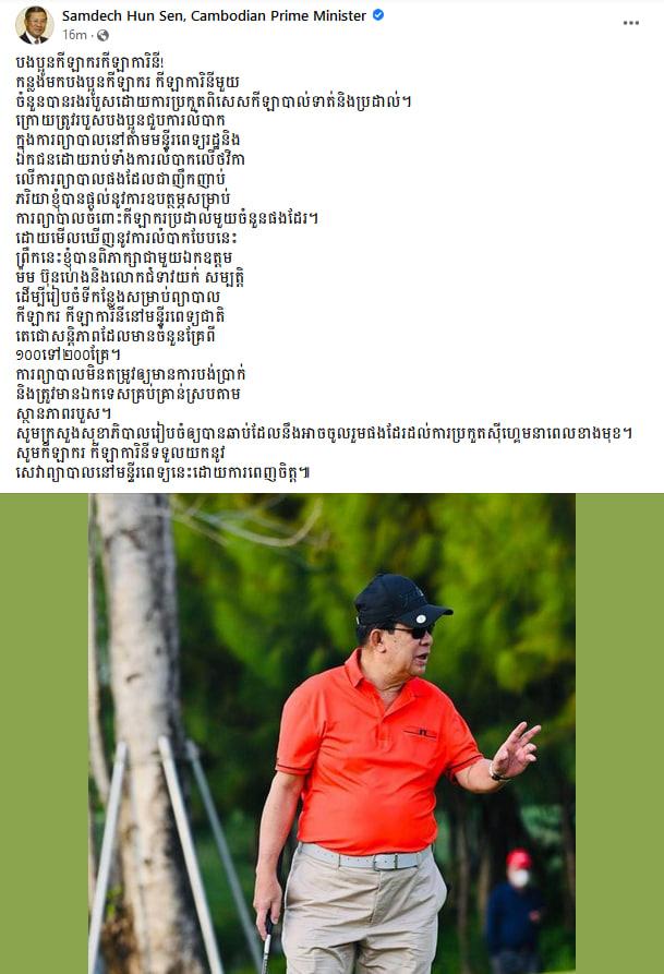 ដោយមើលឃើញនូវការលំបាកបែបនេះ ព្រឹកនេះខ្ញុំបានពិភាក្សាជាមួយឯកឧត្តម ម៉ម ប៊ុនហេង និងលោកជំទាវ យក់ សម្បត្តិ ដើម្បីរៀបចំទីកន្លែងសម្រាប់ព្យាបាល កីឡាករ កីឡាការិនីនៅមន្ទីរពេទ្យជាតិតេជោសន្តិភាពដែលមានចំនួនគ្រែពី ១០០ទៅ២០០គ្រែ។