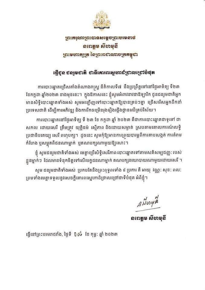 ភ្នំពេញ: ព្រះករុណាព្រះបាទសម្តេចព្រះបរមនាថ នរោត្តម សីហមុនី ព្រះមហាក្សត្រ នៃព្រះរាជាណាចក្រកម្ពុជា បានអំពាវនាវជូនជនរួមជាតិអ្នក មានសិទ្ធិបោះឆ្នោតទាំងអស់ សូមអញ្ជើញទៅបោះឆ្នោតឱ្យបានគ្រប់ៗគ្នា ជ្រើសរើសអ្នកដឹកនាំ ប្រទេសជាតិ ដើម្បីការអភិវឌ្ឍ និងការរីកចម្រើនរុងរឿងថ្កើងថ្កានលើគ្រប់វិស័យ។ នេះបើយោងតាមព្រះរាជសាររបស់ព្រះមហាក្សត្រ ចុះថ្ងៃទី៨ ខែកុម្ភៈ ឆ្នាំ២០២៣។