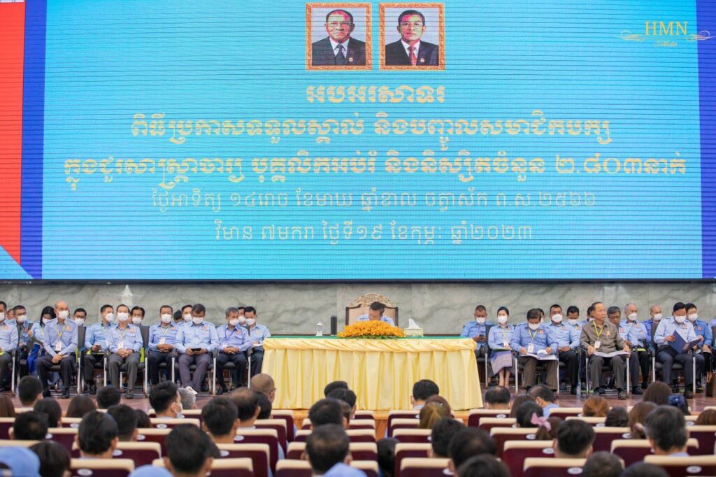 ភ្នំពេញ: ឯកឧត្តម បណ្ឌិត ហ៊ុន ម៉ាណែត សមាជិកគណៈអចិន្រ្តៃយ៍គណៈកម្មាធិការកណ្តាលគណបក្សប្រជាជនកម្ពុជា និងជាប្រធានយុវជនគណបក្សប្រជាជនកម្ពុជាថ្នាក់កណ្តាល ក្នុងពិធីប្រកាសទទួលស្គាល់ និងបញ្ចូលសមាសភាពសាស្ត្រាចារ្យ បុគ្គលិកអប់រំ និងនិស្សិត ចំនួនជិត ៣ ពាន់នាក់ ជាសមាជិកយុវជនគណបក្សប្រជាជនកម្ពុជា។
