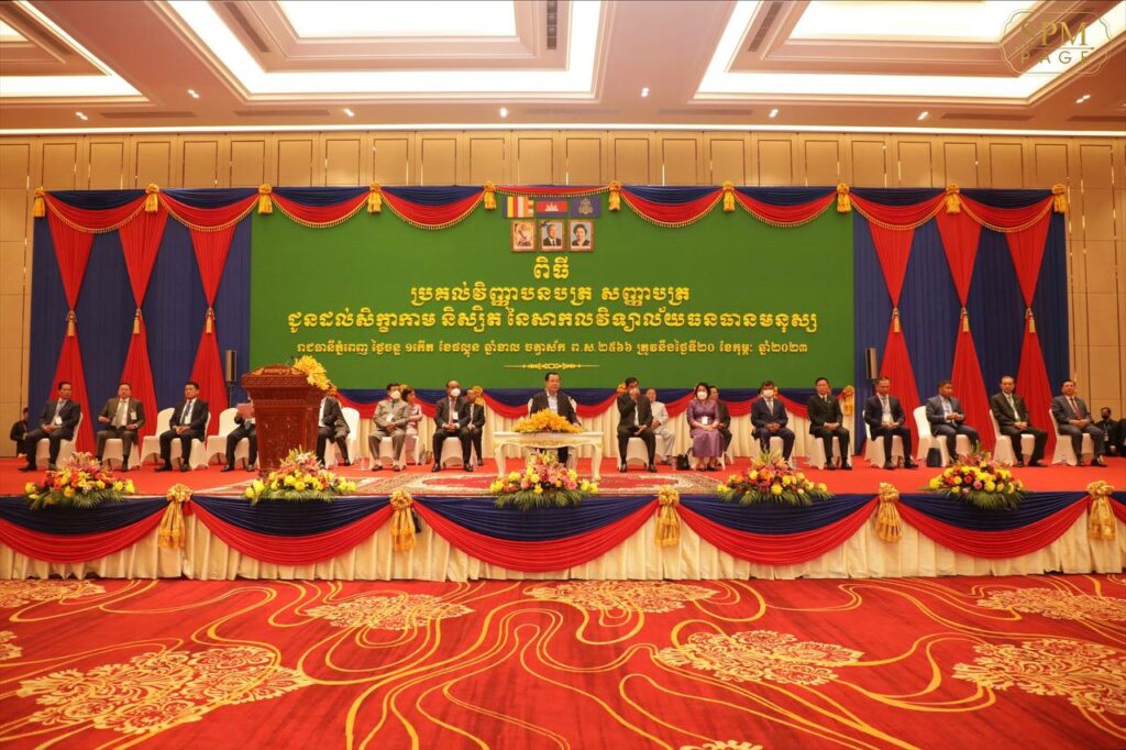 នៅព្រឹកថ្ងៃចន្ទ ទី២០ ខែកុម្ភៈ ឆ្នាំ២០២៣ នេះ សម្តេចអគ្គមហាសេនាបតីតេជោ ហ៊ុន សែន នាយករដ្ឋមន្ត្រីនៃព្រះរាជាណាចក្រកម្ពុជា បានអញ្ជើញជាអធិបតីក្នុងពិធីប្រគល់វិញ្ញាបនបត្រ និងសញ្ញាបត្រ ជូនដល់សិស្សថ្នាក់វិជ្ជាជីវៈ និងនិស្សិតសាកលវិទ្យាល័យធនធានមនុស្សសរុបប្រមាណ សរុបចំនួន ១,៩៤៦នាក់ ក្នុងនោះ នារី ១,០៣៣នាក់។ វិធីនេះត្រូវធ្វើឡើងនៅមជ្ឈមណ្ឌលពិពណ៌ពាណិជ្ជកម្មជ្រោយចង្វារ (OCIC)។
