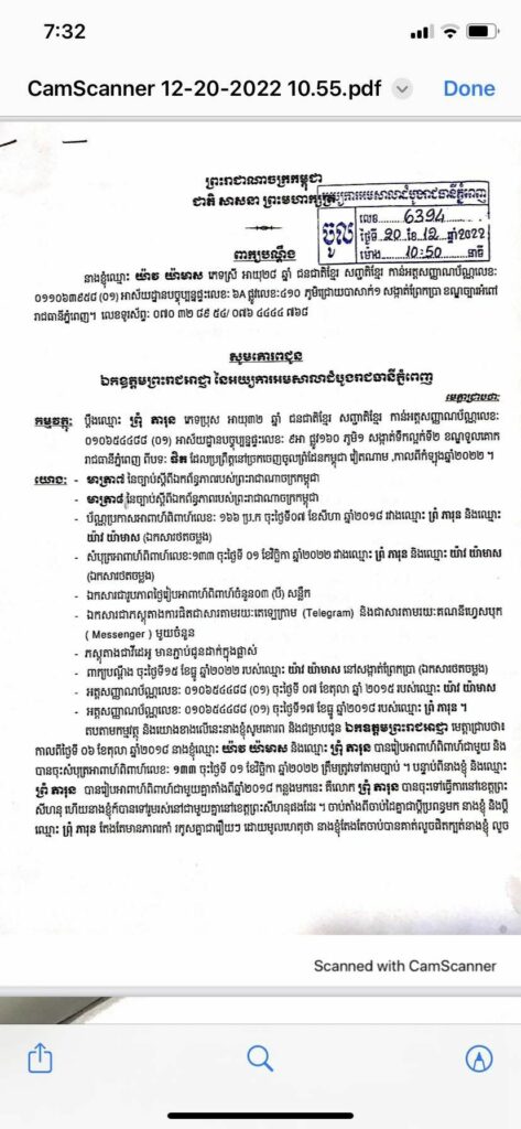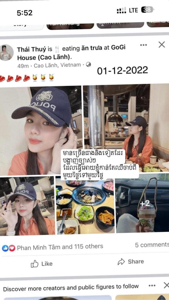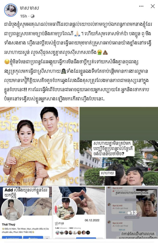 នេះបើតាមនារីជាប្រពន្ធមានគណនីហ្វេសប៊ុកឈ្មោះ មាស មាស បានសម្រេចចិត្តទម្លាយចេញភស្តុតាងស្តែងៗ ប្តីរបស់ខ្លួនដែលទើបមានការងារជាមន្រ្តីរាជការ និងបានឡើងបុណ្យស័ក្តបន្តិចបន្តួច បែរជាបែកឆ្វេង ទៅមានស្រីថ្មីជាជនជាតិវៀតណាម និងភ្ជាប់ក្រដាសពាក្យបណ្តឹងផ្នែកតាមច្បាប់ស្តីពីឯកពន្ធភាព ដោយបានរៀបរាប់ទាំងកំហឹងឈឺចាប់ថា៖ «ជាដំបូង ខ្ញុំសូមអរគុណដល់មេធាវីដែលបានផ្តល់យោបល់តាមច្បាប់ឯកពន្ធភាពមកនាងខ្ញុំ ដែលជាប្រពន្ធស្របតាមច្បាប់ និងតាមប្រពៃណី។ ហើយក៏សូមទោសម៉ាក់ប៉ា បងប្អូន ពូ មីងទាំងសងខាង រឿងនេះប្តីរបស់ខ្ញុំបានធ្វើអោយមុខមាត់គ្រួសារអាប់អោនយ៉ាងខ្លាំង នូវទង្វើរសាហាយស្មន់ លួចស៊ីដូចសត្វត្មាតលួចស៊ីសាកសពចឹង»។