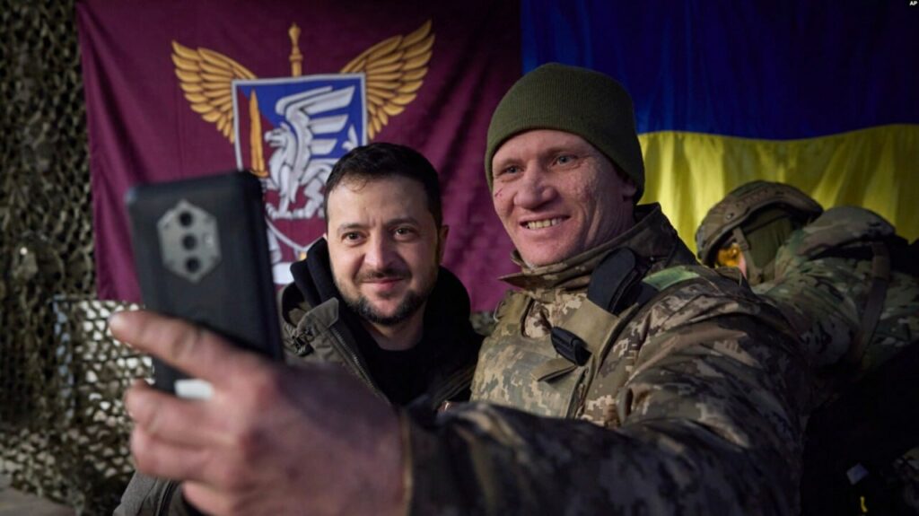 រដ្ឋធានីកៀវ៖ រហូតមកដល់ពេលនេះ ថ្វីបើការវាយប្រយុទ្ធគ្នាយ៉ាងសាហាវ រវាងកងទ័ពអ៊ុយក្រែន និង ទាហានរុស្ស៊ី កំពុងតែក្រាញននៀល នៅទីក្រុងបាកមូ យ៉ាងណាក្ដី ប៉ុន្ដែប្រធានាធិបតី លោក វ៉ូឡូឌីមៀរ ហ្សេឡែនស្គី នៅតែបន្ដធ្វើដំណើរ ទៅសួរសុខទុក្ខដល់កងកម្លាំងរបស់ខ្លួន នៅសមរភូមិប្រយុទ្ធដ៏ក្ដៅគគុកដដែល។