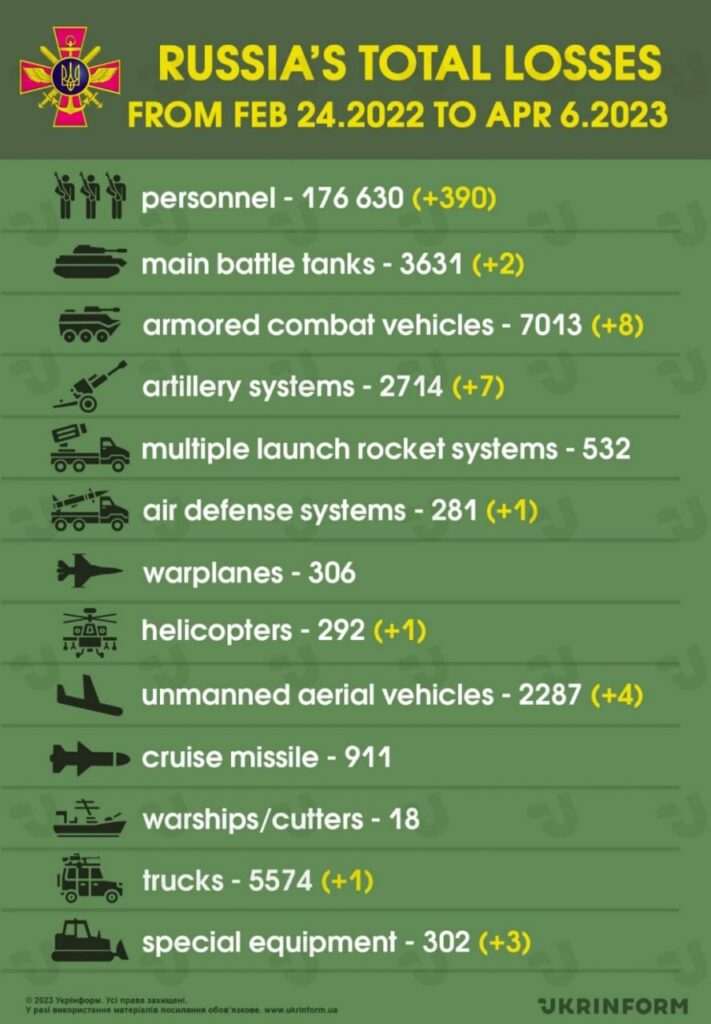 សារព័ត៌មាន Ukrinform បានចេញផ្សាយ កាលពីថ្ងៃព្រហស្បតិ៍ ទី៦ ខែមេសា ឆ្នាំ២០២៣ ថា បើតាមអគ្គសេនាធិការ កងទ័ពអ៊ុយក្រែន បានចុះផ្សាយ នៅលើបណ្ដាញសង្គមហ្វេសប៊ុក កាលពីថ្ងៃព្រហស្បតិ៍ ថា នៅក្នុងរយៈពេល២៤ម៉ោងកន្លងមកនេះ ទាហានរុស្ស៊ី បានបាត់បង់ជីវិត ចំនួន៣៩០នាក់។ ជាមួយនឹងចំនួនអ្នកស្លាប់ថ្មីនេះ ធ្វើឲ្យរុស្ស៊ី បាត់បង់កងទ័ពរួចមកហើយ កើនឡើង រហូតដល់ ១៧៦ ៦៣០នាក់ ចាប់តាំងពីថ្ងៃផ្ទុះសង្គ្រាមដំបូង នាថ្ងៃទី២៤ ខែកុម្ភៈ ឆ្នាំ២០២២ រហូតដល់ថ្ងៃទី៦ ខែមេសា ឆ្នាំ២០២៣។