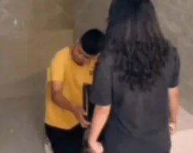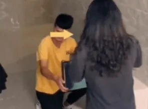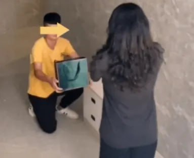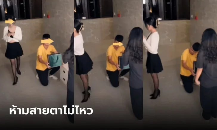 នៅក្នុងឃ្លីបដែលបានពីកាមេរ៉ាសុវត្ថិភាព បានបង្ហាញថា បុរសតែងខ្លួនធម្មតាៗម្នាក់ កំពុងអង្គុយលុតជង្គង់ហុចថង់កាដូជូនសង្សារដែលឈរនៅពីមុខគេ ខណៈដែលនាងក្រមុំ ក៏ស្លៀកពាក់យ៉ាងសាមញ្ញ ព្រោះមិននឹកស្មានថា ស្ថានការណ៍បែបនេះនឹងកើតឡើង។ នាងក្រមុំបានបង្ហាញកាយវិការចម្លែកចិត្តយ៉ាងខ្លាំង នៅពេលឃើញសង្សាររបស់ខ្លួន មកដល់កន្លែងធ្វើការរបស់នាង ដើម្បីសុំនាងរៀបការ។