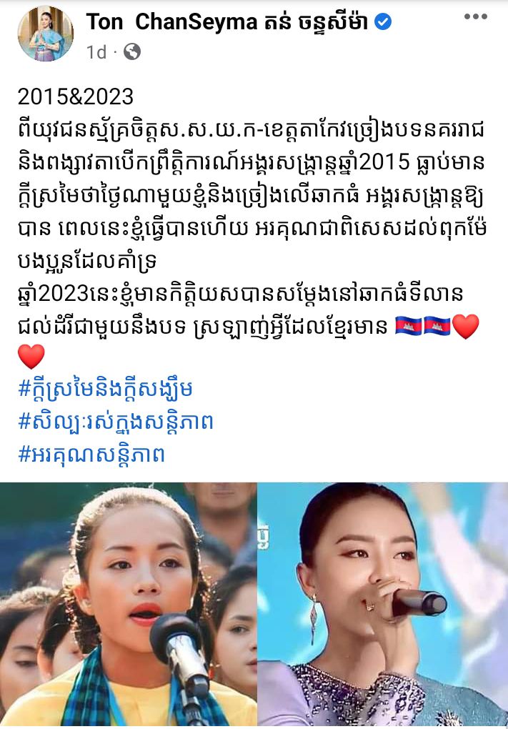 តារាចម្រៀង តន់ ចាន់ សីម៉ា បានលើកឡើងតាមរយះសំណេរបង្ហោះតាមហ្វេសប៊ុកថា 2015&2023 ពីយុវជនស្ម័គ្រចិត្ត ស.ស.យ.ក-ខេត្តតាកែវច្រៀងបទនគររាជ និងពង្សាវតាបើកព្រឹត្តិការណ៍អង្គរសង្ក្រាន្ត ឆ្នាំ2015 ។