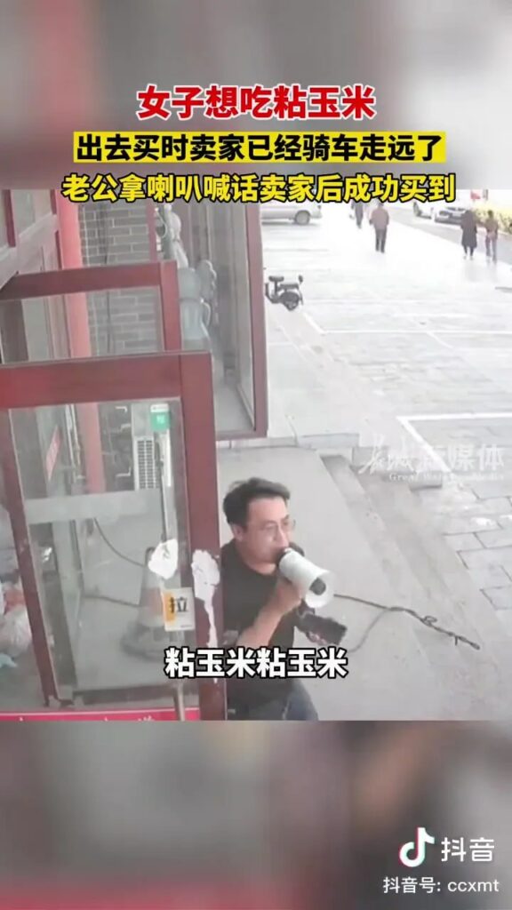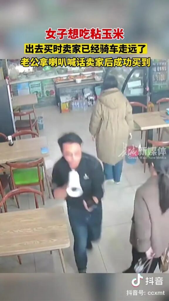 ពេលប្ដីឃើញដូច្នេះ ក៏ប្រញាប់ដើរទៅយកមេក្រូបំពងសំឡេង ហើយស្ទុះរត់ចេញទៅខាងមុខហាងយ៉ាងប្រញាប់ និងស្រែកហៅអ្នកលក់ពោតស្ងោរយ៉ាងខ្លាំងៗឱ្យត្រឡប់មកវិញ ដើម្បីឱ្យគេបានទិញចំណីដែលប្រពន្ធចូលចិត្តនេះយកទៅឱ្យប្រពន្ធញ៉ាំ។