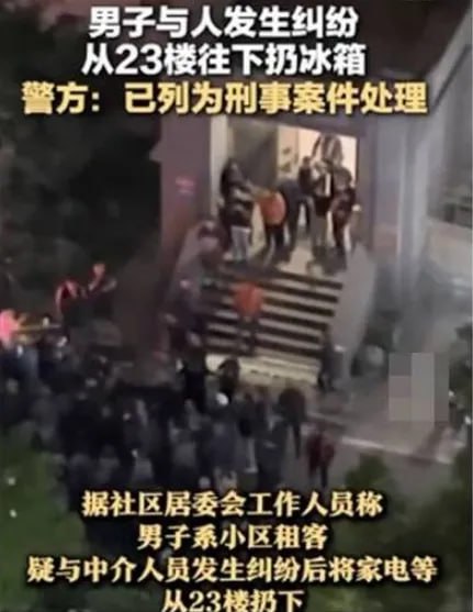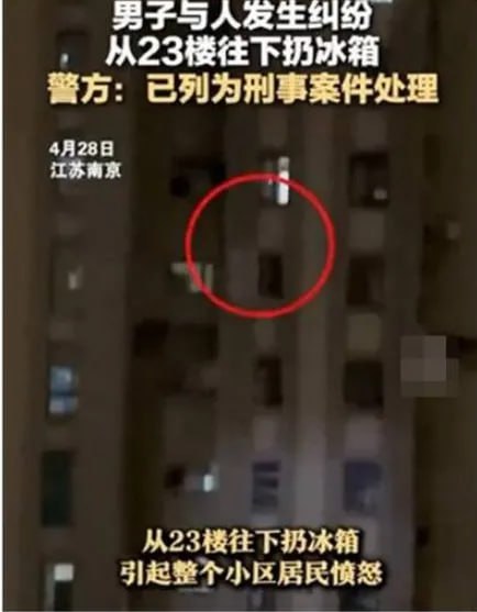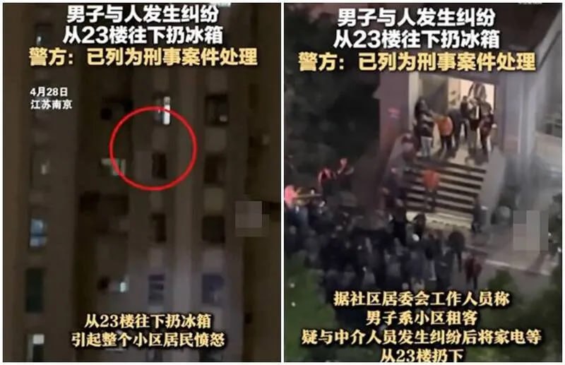 បុរសម្នាក់ដែលស្នាក់នៅក្នុងទីក្រុងណានជីង ប្រទេសចិន បានខឹងសម្បាយ៉ាងខ្លាំងដោយសារតែឈ្លោះគ្នារឿងថ្លៃជួលបន្ទប់ បានលើកទូទឹកកកទម្លាក់មកក្រោម តាំងពីជាន់ទី២៣។ សំណាងល្អណាស់ដែលមិនបង្កឱ្យអ្នកណារងគ្រោះថ្នាក់ តែទង្វើដ៏គ្រោះថ្នាក់នេះ បានទទួលការខឹងសម្បាយ៉ាងខ្លាំងរបស់អ្នកដែលរស់នៅម្ដុំនោះ។