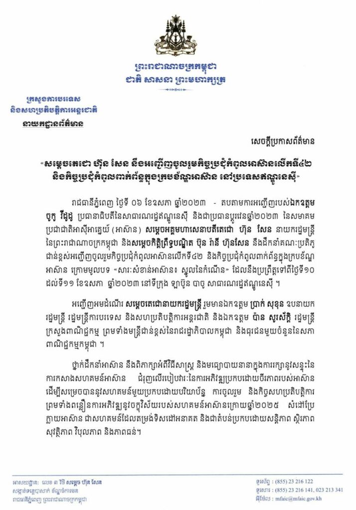 ភ្នំពេញ ៖ តបតាមការអញ្ជើញរបស់ឯកឧត្តម ចូកូ វីដូដូ ប្រធានាធិបតីនៃសាធារណរដ្ឋឥណ្ឌូនេស៊ី និងជាប្រធានប្តូរវេនឆ្នាំ២០២៣ នៃសមាគមប្រជាជាតិអាស៊ីអាគ្នេយ៍ (អាស៊ាន) សម្តេចអគ្គមហាសេនាបតីតេជោ ហ៊ុន សែន នាយករដ្ឋមន្រ្តី នៃព្រះរាជាណាចក្រកម្ពុជា និងសម្តេចកិត្តិព្រឹទ្ធបណ្ឌិត ប៊ុន រ៉ានី ហ៊ុនសែន នឹងដឹកនាំគណៈប្រតិភូជាន់ខ្ពស់ អញ្ជើញចូលរួមកិច្ចប្រជុំកំពូលអាស៊ានលើកទី៤២ និងកិច្ចប្រជុំកំពូលពាក់ព័ន្ធក្នុងក្របខ័ណ្ឌអាស៊ាន ក្រោមមូលបទ «សារៈសំខាន់ អាស៊ាន៖ ស្នូលនៃកំណើន» ដែលនឹងប្រព្រឹត្តទៅពីថ្ងៃទី១០ ដល់ទី១១ ខែឧសភា ឆ្នាំ ២០២៣ នៅទីក្រុង ឡាប៊ូន បាចូ សាធារណរដ្ឋឥណ្ឌូនេស៊ី ។អញ្ជើញអមដំណើរ សម្តេចតេជោនាយករដ្ឋមន្រ្តី រួមមានឯកឧត្ដម ប្រាក់ សុខុន ឧបនាយក រដ្ឋមន្ត្រី រដ្ឋមន្ត្រី ការបរទេស និង សហប្រតិបត្តិការ អន្តរជាតិ និងឯកឧត្តម ប៉ាន សូរស័ក្តិ រដ្ឋមន្រ្តី ក្រសួងពាណិជ្ជកម្ម ព្រមទាំងមន្ត្រីជាន់ខ្ពស់ នៃរាជរដ្ឋាភិបាលកម្ពុជា និងធុរជន មួយចំនួននៃសភា ពាណិជ្ជកម្ម កម្ពុជា ។