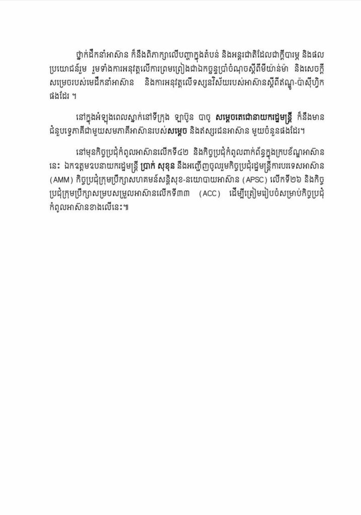នៅមុនកិច្ចប្រជុំកំពូលអាស៊ានលើកទី៤២ និងកិច្ចប្រជុំកំពូលពាក់ព័ន្ធក្នុងក្របខ័ណ្ឌអាស៊ាន នេះ ឯកឧត្តមឧបនាយករដ្ឋមន្ត្រី ប្រាក់ សុខុន នឹងអញ្ជើញចូលរួមកិច្ចប្រជុំរដ្ឋមន្ត្រីការបរទេសអាស៊ាន (AMM) កិច្ចប្រជុំក្រុមប្រឹក្សាសហគមន៍សន្តិសុខ-នយោបាយអាស៊ាន (APSC) លើកទី២៦ និងកិច្ចប្រជុំ ក្រុមប្រឹក្សាសម្របសម្រួលអាស៊ានលើកទី៣៣ (ACC) ដើម្បីត្រៀមរៀបចំសម្រាប់ កិច្ចប្រជុំ កំពូល អាស៊ាន ខាងលើនេះ៕ រក្សាសិទ្ធដោយ : ចេស្តារ