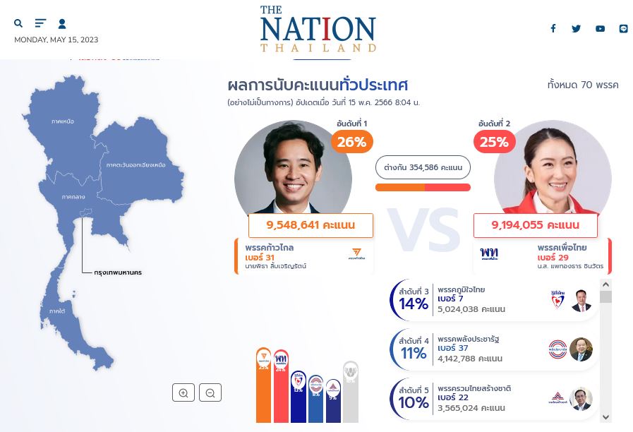 គួរបញ្ជាក់ថា គណបក្សចលនាឆ្ពោះទៅមុខ (MFP) និងគណបក្សភឿថៃ ត្រូវបានគេរំពឹងថា នឹងឈ្នះអាសនៈចំនួន ២៩២អាសនៈ ក្នុងចំណោម ៥០០អាសនៈនៅក្នុងសភាតំណាងរាស្រ្ត ខណ:គណបក្សចំនួន២ទៀត ដែលចូលបក្សសម្ព័ន្ធយោធាដ៏សំខាន់នោះទទួលបានត្រឹមតែ ៧៦ប៉ុណ្ណោះ។