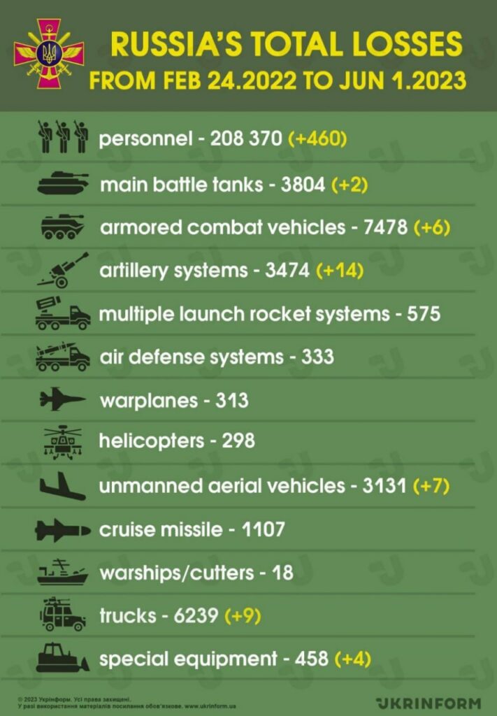 ប្រភពដដែល បានបន្ដ ថា បើគិតចាប់តាំងពីការផ្ទុះសង្គ្រាម នៅថ្ងៃទី២៤ ខែកុម្ភៈ ឆ្នាំ២០២២ រហូតមកដល់ថ្ងៃទី១ ខែមិថុនា ឆ្នាំ២០២៣ រុស្ស៊ី បានបាត់បង់កម្លាំងទាហាន នៅលើសមរភូមិប្រយុទ្ធ កើនឡើង ដល់ ២០៨ ៣៧០នាក់។ ចាប់តាំងពីពេលផ្ទុះសង្គ្រាម រហូតមកដល់ពេលនេះ កងទ័ពអ៊ុយក្រែន បានកម្ទេចគ្រឿងសព្វាវុធរបស់សត្រូវ កើនឡើងយ៉ាងច្រើន រួមមាន យន្ដហោះចម្បាំង ចំនួន៣១៣គ្រឿង, ឧទ្ធម្ភាគចក្រ ចំនួន ២៩៨គ្រឿង, នាវាចម្បាំងតូចធំ ចំនួន១៨គ្រឿង, រថក្រោះ ចំនួន ៣ ៨០៤គ្រឿង, រថពាសដែក ចំនួន ៧ ៤៧៨គ្រឿង, ប្រព័ន្ធកាំភ្លើងផ្លោង ចំនួន ៣ ៤៧៤គ្រឿង, ប្រព័ន្ធបាញ់គ្រាប់រ៉ុក្កែតចម្រុះ ចំនួន ៥៧៥គ្រឿង, ប្រព័ន្ធការពារដែនអាកាស ចំនួន៣៣៣គ្រឿង, ដ្រូន ចំនួន ៣ ១៣១គ្រឿង, មីស៊ីលគ្រូស ចំនួន ១ ១០៧គ្រាប់, រថយន្ដ ចំនួន ៦ ២៣៩គ្រឿង និង គ្រឿងចក្រពិសេស ចំនួន៤៥៨គ្រឿង។