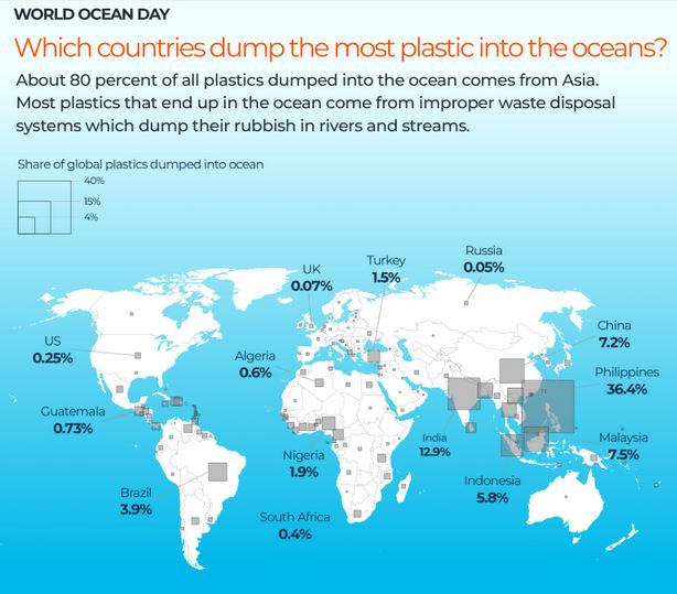 អង្គការស្រាវជ្រាវវិទ្យាសាស្រ្ដឈានមុខ បានសិក្សា នៅក្នុងឆ្នាំ២០២១ រកឃើញ ថា ប្លាស្ទិក ប្រហែល៨០ភាគរយ ដែលបានរកឃើញ នៅក្នុងមហាសមុទ្រ កើតចេញពីទ្វីបអាស៊ី។ ចំណែកប្រទេសហ្វីលីពីន ត្រូវគេជឿ ថា ជាប្រភពកាកសំណល់ប្លាស្ទិក ជាង១ភាគ៣ ឬប្រហែល៣៦,៤ភាគយ នៃកាកសំណល់ប្លាស្ទិក នៅក្នុងសមុទ្រ។ ចំណែកប្រទេសបន្ទាប់ រួមមាន ឥណ្ឌា មានប្រហែល១២,៩ភាគរយ ខណៈម៉ាឡេស៊ី មានប្រហែល៧,៥ភាគរយ ហើយចិន មានប្រហែល ៧,២ភាគរយ និង ឥណ្ឌូណេស៊ី ប្រហែល ៥,៨ភាគរយ៕ រក្សាសិទ្ធដោយ ៖ សារាយSN