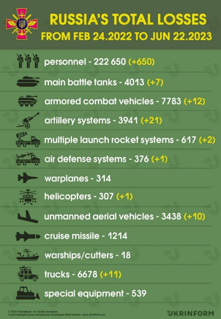 សារព័ត៌មាន Ukrinform បានចេញផ្សាយ កាលពីរសៀល ថ្ងៃព្រហស្បតិ៍ ទី២២ ខែមិថុនា ឆ្នាំ២០២៣ ថា អគ្គសេនាធិការកងទ័ពអ៊ុយក្រែន បានបង្ហោះ នៅលើបណ្ដាញសង្គមហ្វេសប៊ុក កាលពីថ្ងៃព្រហស្បតិ៍ ថា កងទ័ពអ៊ុយក្រែន បានសម្លាប់ទាហានរុស្ស៊ី កើនដល់ ២២២ ៦៥០នាក់ គិតចាប់តាំងពីថ្ងៃទី២៤ ខែកុម្ភៈ ឆ្នាំ២០២២ ដល់ថ្ងៃទី២២ ខែមិថុនា ឆ្នាំ២០២៣។