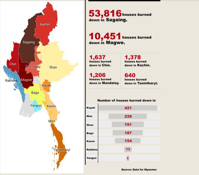 សារព័ត៌មានរបស់ភូមា The Irrawaddy (ឌឺ អ៊ីរ៉ាវ៉ាដឌី) បានចេញផ្សាយ កាលពីថ្ងៃអង្គារ ទី២៧ ខែមិថុនា ថា អំពើរដ្ឋប្រហារយោធា នៅក្នុងប្រទេសមីយ៉ាន់ម៉ា បានសម្លាប់មនុស្ស កើនឡើងជាង៤ពាន់នាក់ ហើយកងទ័ព នៃរដ្ឋាភិបាលយោធាមីយ៉ាន់ម៉ា បានដុតផ្ទះសម្បែងរបស់ប្រជាចន ចំនួន ៧០ ៣២៤ខ្នង ចាប់តាំងពីថ្ងៃទី១ ខែកុម្ភៈ ឆ្នាំ២០២១ ដល់ចុងខែឧសភា ឆ្នាំ២០២៣ នៅក្នុងរដ្ឋចំនួន១៣ និង តំបន់ចំនួន១៤ នៃប្រទេសអាស៊ានមួយនេះ។ នេះបើយោងតាមរបាយការណ៍ ត្រូវបានចេញផ្សាយ ដោយទិន្នន័យ សម្រាប់ប្រទេសមីយ៉ាន់ម៉ា។