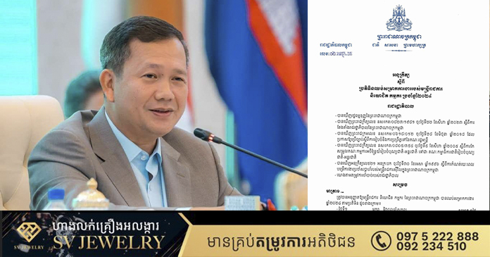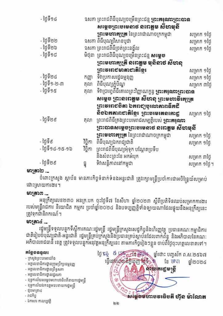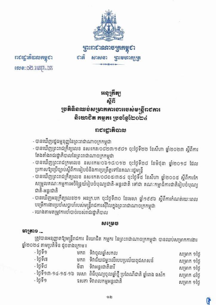 ភ្នំពេញ៖ សម្តេចមហាបវរធិបតី ហ៊ុន ម៉ាណែត នាយករដ្ឋមន្ត្រីនៃកម្ពុជា បានចេញអនុក្រឹត្យ ស្តីពីប្រតិទិនឈប់សម្រាកការងារ របស់មន្ត្រីរាជការ និយោជិត កម្មករ ប្រចាំឆ្នាំ២០២៤៕ រក្សាសិទ្ធដោយ ៖ សុទ្ធលី