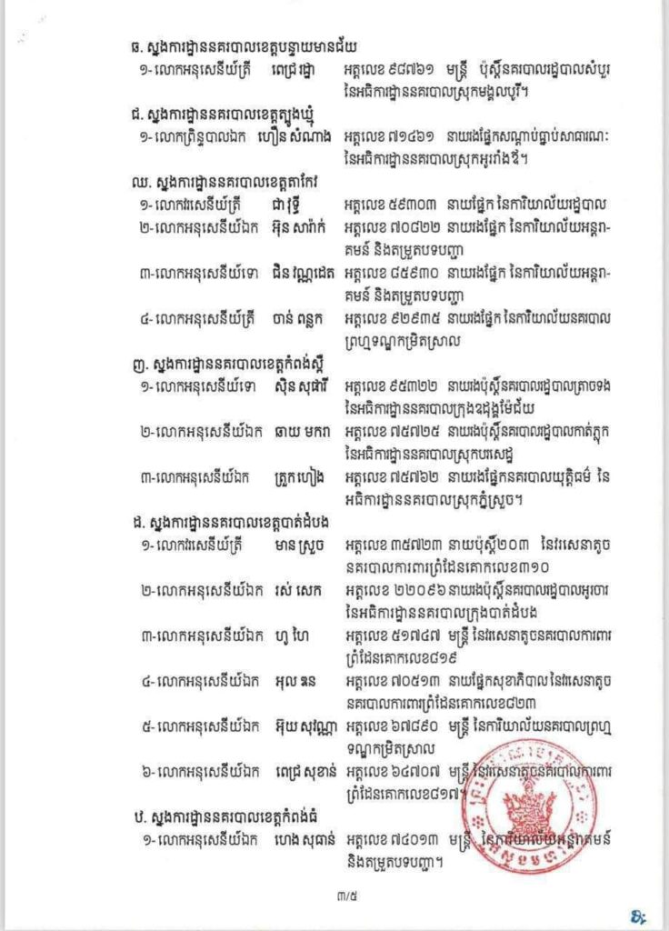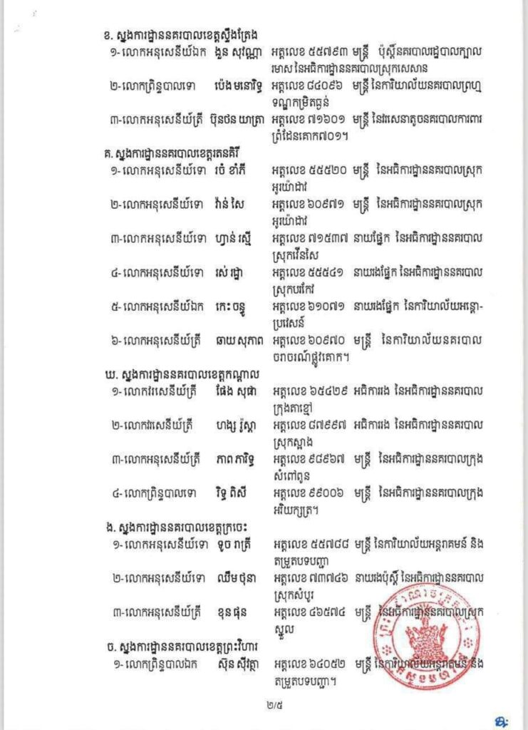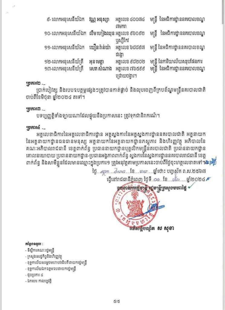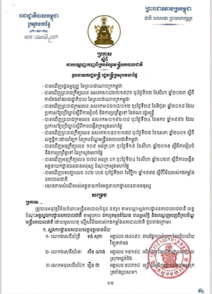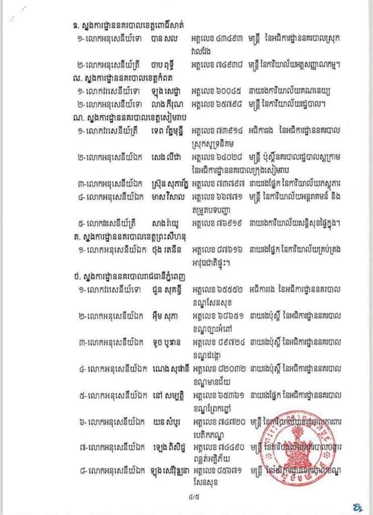 ភ្នំពេញ៖ ឯកឧត្តមអភិសន្តិបណ្ឌិត ស សុខា ឧបនាយករដ្ឋមន្ត្រី រដ្ឋមន្ត្រីក្រសួងមហាផ្ទៃ សម្រេចអនុវត្តវិន័យចំពោះមន្ត្រីនគរបាលចំនួន ៥៩រូប តាមបណ្តាស្នងការដ្ឋាននគរបាលរាជធានី ខេត្ត ចំណុះអគ្គស្នងការដ្ឋាននគរបាលជាតិ តាមរូបភាព ដកហូតមុខតំណែង ឋានន្តរស័ក្តិ និងបណ្តេញចេញពីក្របខ័ណ្ឌ មន្ត្រីនគរបាលជាតិ ដោយមូលហេតុ ល្មើសវិន័យរបស់កងកម្លាំងនគរបាលជាតិ៕ រក្សាសិទ្ធដោយ ៖ សុទ្ធលី