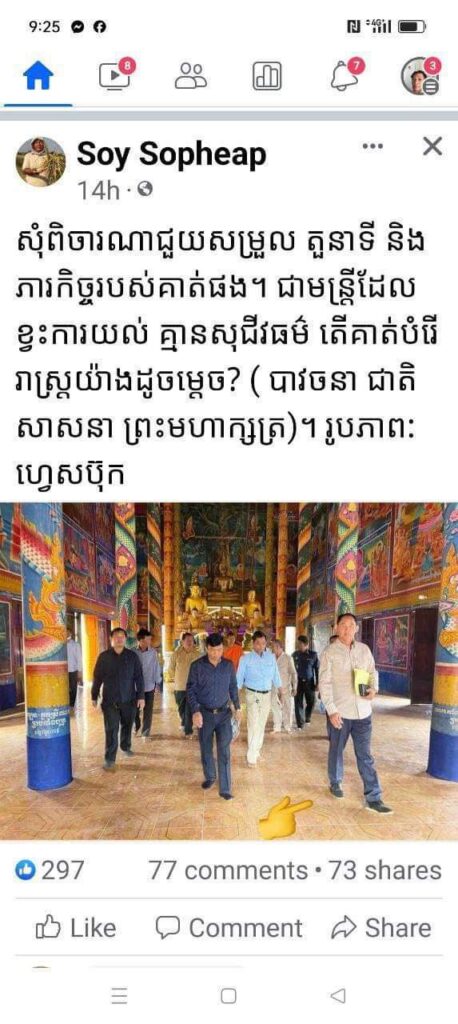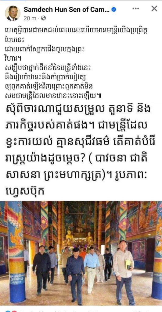 តាមរយៈបណ្តាញទំនាក់ទំនងសង្គម Facebook នៅព្រឹកថ្ងៃទី១៧ ខែមីនា ឆ្នាំ២០២៤នេះ សម្តេចតេជោ ហ៊ុន សែន បានដាក់ចេញជាសំណួរថា ហេតុអ្វីបានជាមកដល់ពេលនេះហើយមានមន្ត្រីយើងប្រព្រឹត្តបែបនេះ ដោយពាក់ស្បែកជើងចូលក្នុងព្រះវិហារ?