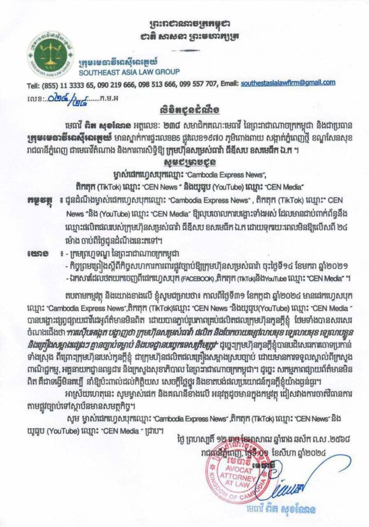 រាជធានីភ្នំពេញ : កំណត់ការិយាល័យនិពន្ធ (ក.ក.ន ) CEN បានឃើញ ” លិខិតជូនដំណឹងរបស់ មេធាវី ពិត សុខណែន ” អត្ថលេខ : ២៣៨ សមាជិកគណៈមេធាវីនៃព្រះរាជាណាចក្រកម្ពុជា និងជាប្រធានក្រុមមេធាវីអាស៊ីអាគ្នេយ៍, មានស្នាក់ការផ្ទះ លេខ B5 ផ្លូវលេខ ១៩៧០ ភូមិពោងពាយ សង្កាត់ភ្នំពេញថ្មី ខណ្ឌសែនសុខ រាជធានីភ្នំពេញ ជាមេធាវីតំណាង និងការពារសិទ្ធិឱ្យក្រុមហ៊ុន សម្រស់ធារ៉ា ធីឌីសប ខសមេធីក ឯ.ក បានជម្រាបជូន ÷