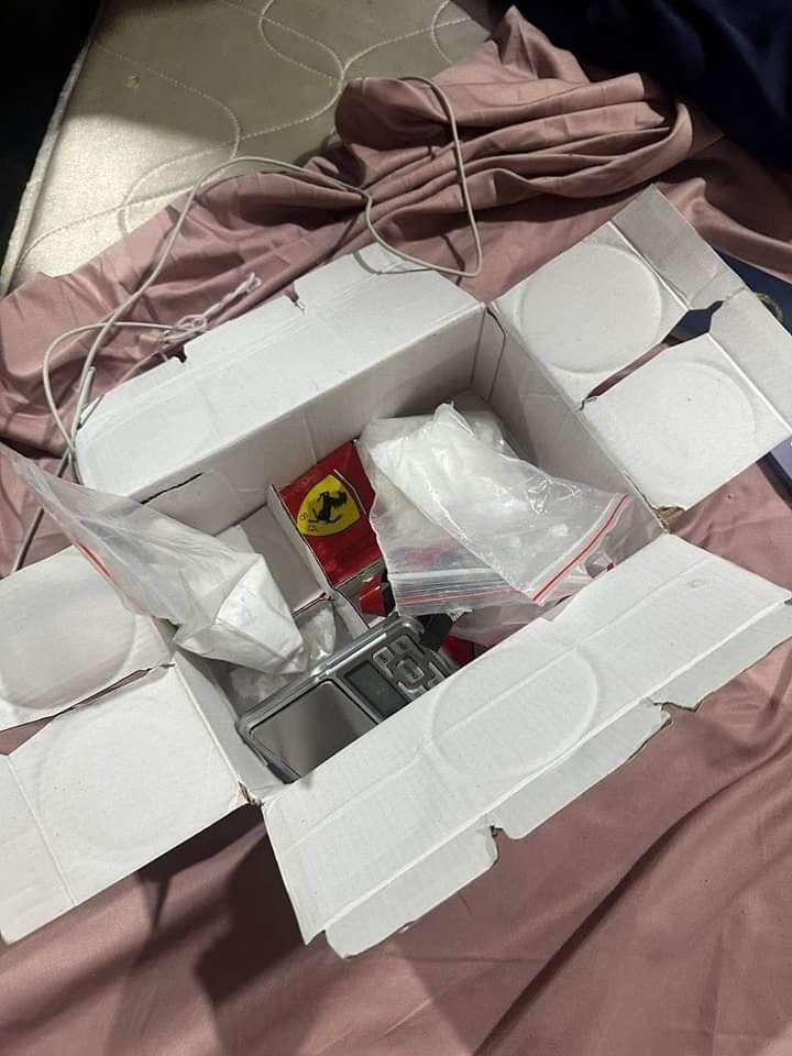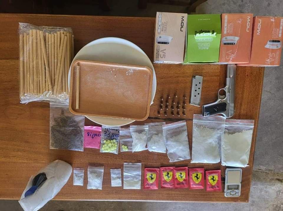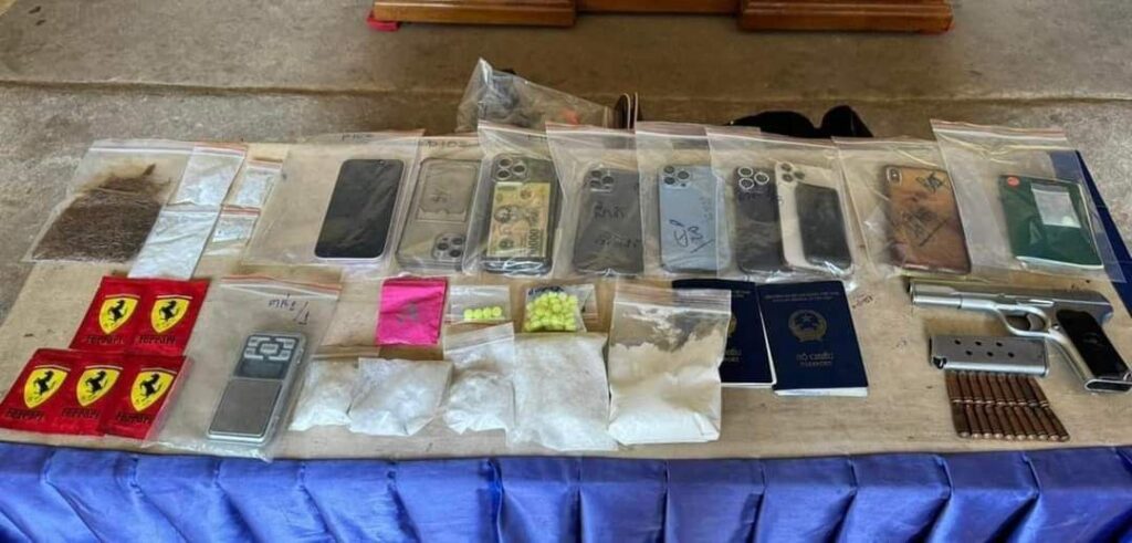-រុក្ខជាតិក្រៀម០១កញ្ចប់។ – ជញ្ជីងថ្លឹងថ្នាំញៀន ០១គ្រឿង។ – អាវុធខ្លី០១ដើម(ម៉ាកK54)បង់០១ គ្រាប់១៩គ្រាប់។ – ទូរស័ព្ទដៃ ១៣ គ្រឿង។
