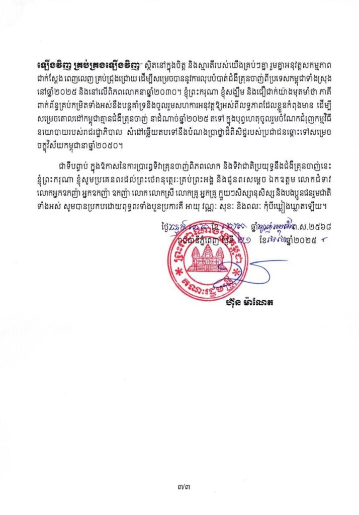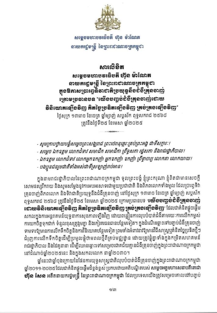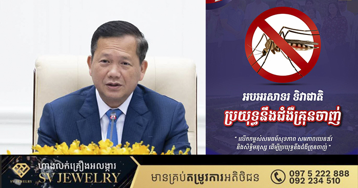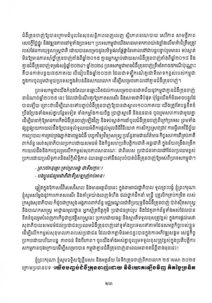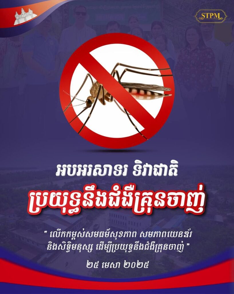 ភ្នំពេញ ៖ សម្តេចមហាបវរធិបតី ហ៊ុន ម៉ាណែត នាយករដ្ឋមន្ត្រី នៃព្រះរាជាណាចក្រកម្ពុជា បានចេញសារលិខិតក្នុងឱកាសប្រារព្ធទិវាជាតិប្រយុទ្ធនឹងជំងឺគ្រុនចាញ់ ក្រោមប្រធានបទ “យើងបញ្ចប់ជំងឺគ្រុនចាញ់ដោយ វិនិយោគឡើងវិញ គិតច្នៃប្រឌិតឡើងវិញ គ្រប់គ្រងឡើងវិញ” ថ្ងៃសុក្រ ១៣រោច ខែចេត្រ ឆ្នាំម្សាញ់ សប្តស័ក ពុទ្ធសករាជ ២៥៦៨ ត្រូវនឹងថ្ងៃទី២៥ ខែមេសា ឆ្នាំ២០២៥។