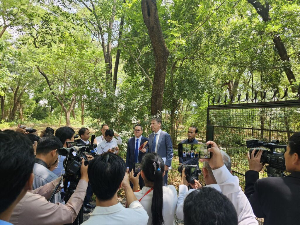 បន្ទាប់មក អ្នកសារព័ត៌មានបានទស្សនាឧទ្យានស្ថានទូត ជាពិសេសកន្លែងរក្សាអតីតក្លោងទ្វារស្ថានទូត មួយថ្ងៃមុនការសម្ពោធពិព័រណ៍រំលឹកខួប៥០ឆ្នាំនៃការឡើងកាន់អំណាចរបស់ខ្មែរក្រហមនៅភ្នំពេញ រៀបចំឡើងដោយស្ថានទូតបារំាង និងវិទ្យាស្ថានបារាំងនៅកម្ពុជា(IFC)។