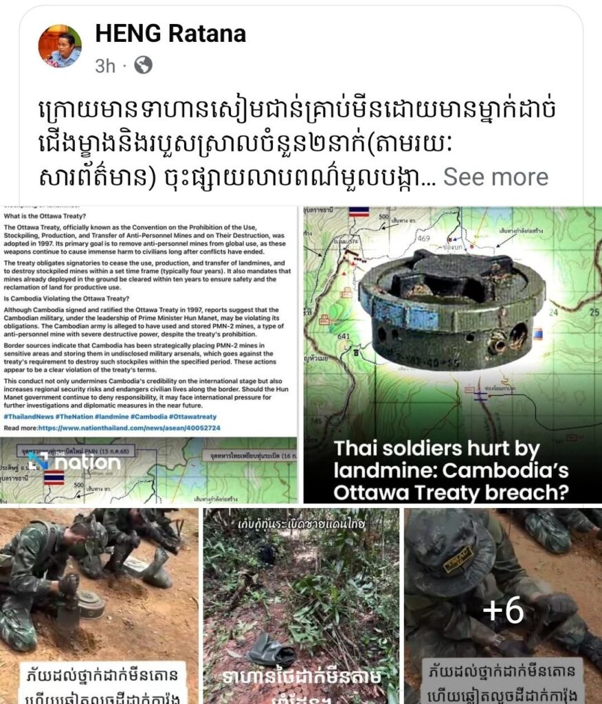 ភ្នំពេញ ៖ ឯកឧត្តម ហេង រតនា អគ្គនាយកស៊ីម៉ាក់ នៅថ្ងៃទី១៩ខែកក្កដានេះ បានថ្លែងថា ក្រោយមានទាហានសៀមជាន់គ្រាប់មីនដោយមានម្នាក់ដាច់ជេីងម្ខាងនិងរបួសស្រាលចំនួន២នាក់(តាមរយៈសារព័ត៌មាន) ចុះផ្សាយលាបពណ៌មួលបង្កាច់កម្ពុជា រឿងគ្រាប់មីនចាស់ និងគ្រាប់មីនដាក់ថ្មី! រដ្ឋមន្ត្រីការពារជាតិសៀមស្តីទី ស្នេីសុំឱ្យកម្ពុជា ដោះគ្រាប់មីនចាស់ៗចេញ មេទ័ពជួរមុខសៀមថាគ្រាប់មីនសល់ពីសង្គ្រាម ក្រុមអង្គការដោះមីននិងក្រសួងការបរទេសសៀមថាគ្រាប់មីនដាក់ថ្មី និងប្រុងប្រៀបប្តឹងកម្ពុជាទៅUN! ជាដេីម…..។