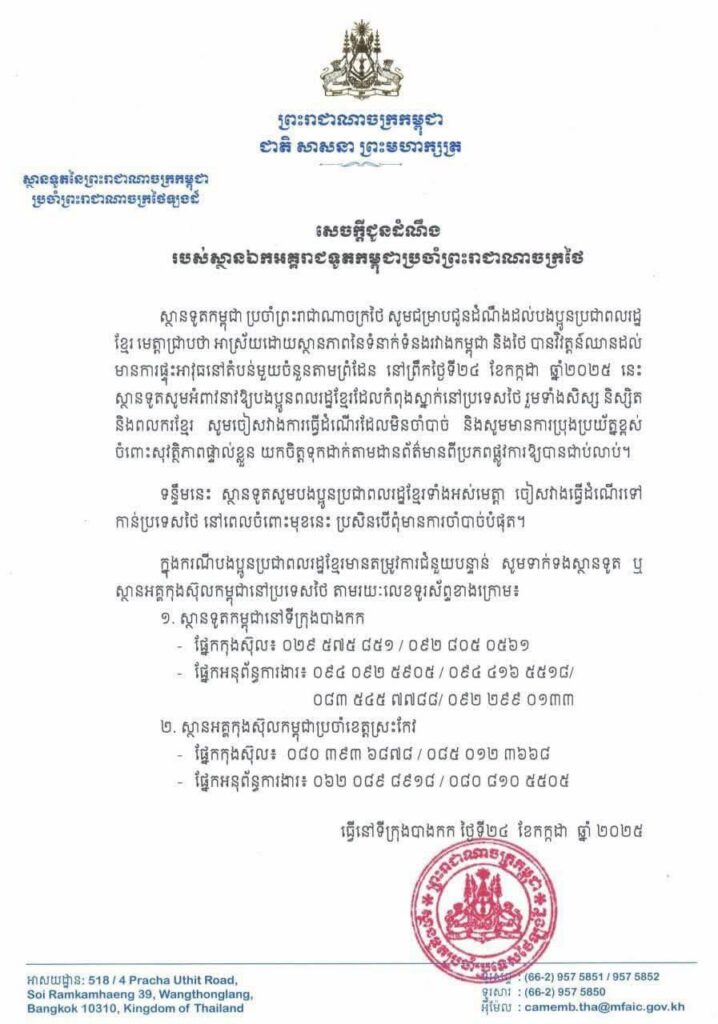 ស្ថានទូតកម្ពុជា ប្រចាំព្រះរាជាណាចក្រថៃ សូមជម្រាបជូនដំណឹងដល់បងប្អូនប្រជាពលរដ្ឋខ្មែរ មេត្តាជ្រាបថា អាស្រ័យដោយស្ថានភាពនៃទំនាក់ទំនងរវាងកម្ពុជា និងថៃ បានវិវត្តន៍ឈានដល់ មានការផ្ទុះអាវុធនៅតំបន់មួយចំនួនតាមព្រំដែន នៅព្រឹកថ្ងៃទី២៤ ខែកក្កដា ឆ្នាំ២០២៥ នេះ ស្ថានទូតសូមអំពាវនាវឱ្យបងប្អូនពលរដ្ឋខ្មែរដែលកំពុងស្នាក់នៅប្រទេសថៃ រួមទាំងសិស្ស និស្សិត និងពលករខ្មែរ សូមចៀសវាងការធ្វើដំណើរដែលមិនចាំបាច់ និងសូមមានការប្រុងប្រយ័ត្នខ្ពស់ ចំពោះសុវត្ថិភាពផ្ទាល់ខ្លួន យកចិត្តទុកដាក់តាមដានព័ត៌មានពីប្រភពផ្លូវការឱ្យបានជាប់លាប់។