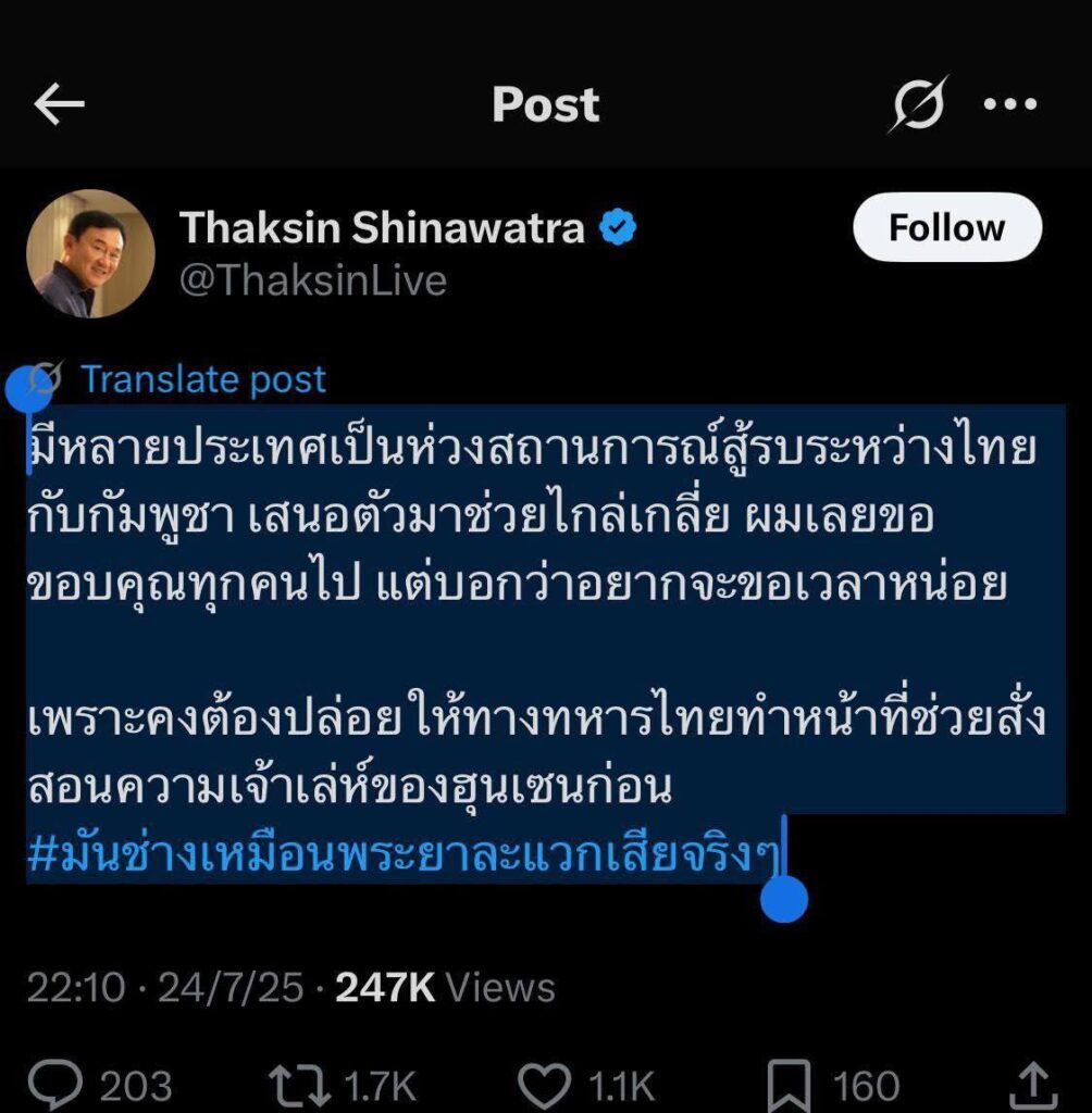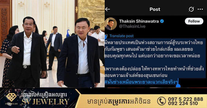 សម្តេចតេជោ ហ៊ុន សែន ប្រធានព្រឹទ្ធសភា បានបញ្ជាក់នៅយប់ថ្ងៃទី ២៤ ខែកក្កដានេះថា៖ មុននេះ ថាក់ សុីន បង្ហោះសារដែលមានចរិតប្រើប្រាស់សង្រ្គាម ដើម្បីប្រដៅ ហ៊ុន សែន។ សំដីរបស់ ថាក់ សុីន កាន់តែបង្ហាញច្បាស់នូវការឈ្លានពានកម្ពុជា ពីសំណាក់កងទ័ពថៃមកលើកម្ពុជា។