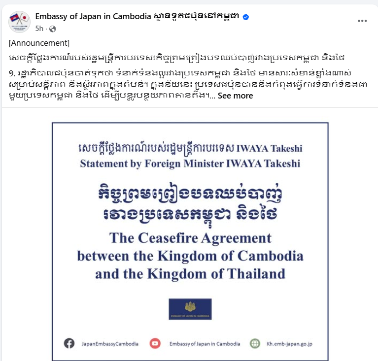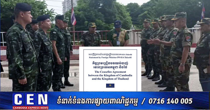 ភ្នំពេញ ៖ ស្ថានទូតជប៉ុននៅកម្ពុជា បានចេញផ្សាយព័ត៌មានឲ្យដឹងថា រដ្ឋមន្ត្រីការបរទេសជប៉ុន បានចេញសេចក្តីថ្លែងការណ៍ស្តីពីកិច្ចព្រមព្រៀងបទឈប់បាញ់រវាងប្រទេសកម្ពុជា និងថៃ។