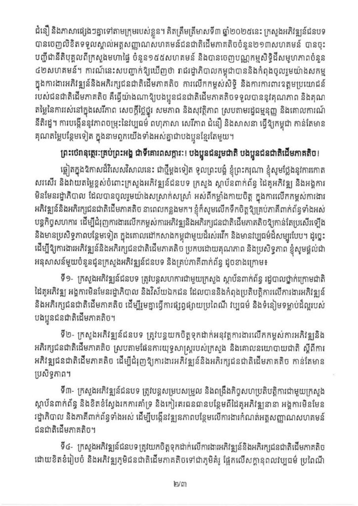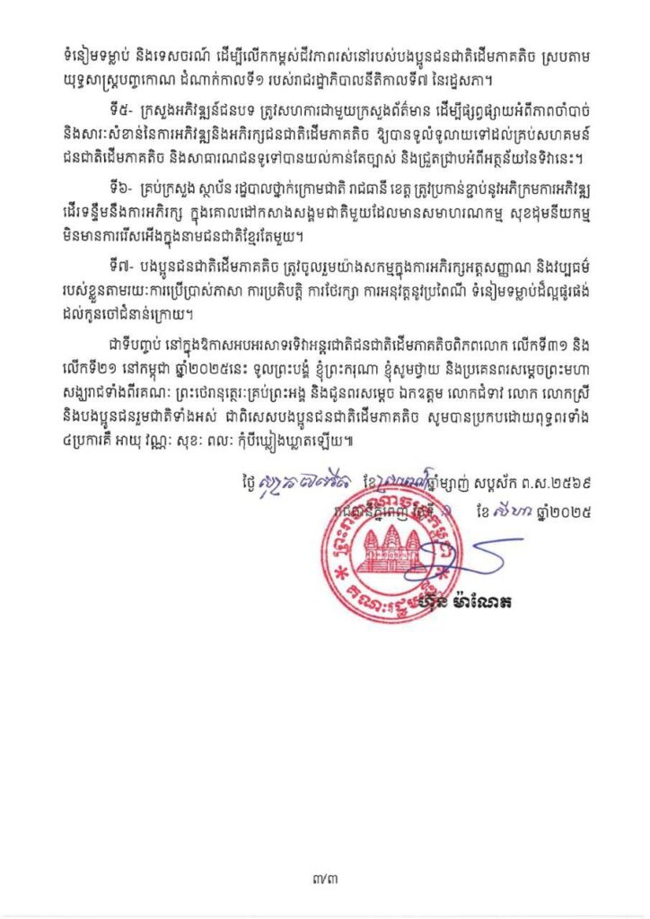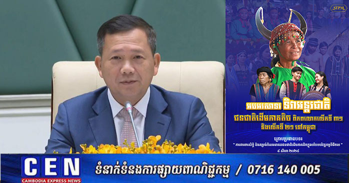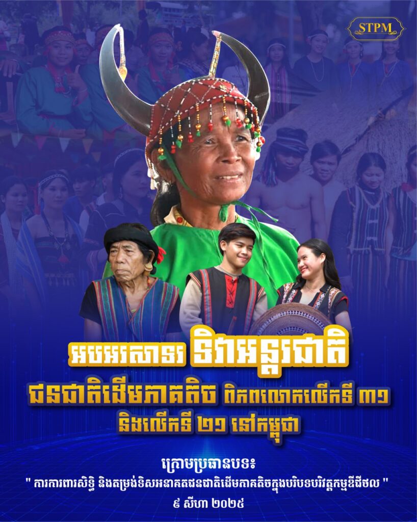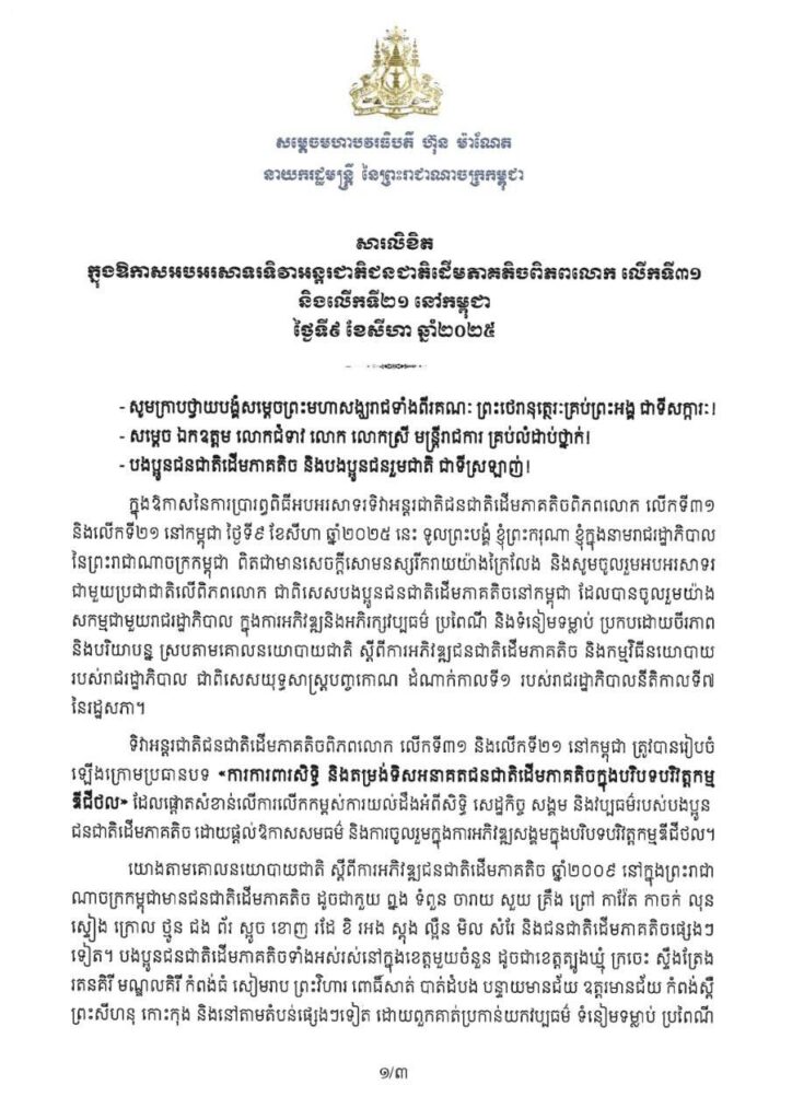 ភ្នំពេញ ៖ សម្តេចមហាបវរធិបតី ហ៊ុន ម៉ាណែត នាយករដ្ឋមន្រ្តីនៃកម្ពុជា បានថ្លែងអបអរសាទរ ទិវាអន្តរជាតិជនជាតិដើមភាគតិចពិភពលោក លើកទី៣១ និងលើកទី២១ នៅកម្ពុជា ក្រោមប្រធានបទ «ការការពារសិទ្ធិ និងតម្រង់ទិសអនាគតជនជាតិដើមភាគតិច ក្នុងបរិបទបរិវត្តកម្ម ឌីជីថល» ដែលផ្តោតសំខាន់លើការលើកកម្ពស់ការយល់ដឹងអំពីសិទ្ធិ សេដ្ឋកិច្ច សង្គម និងវប្បធម៌របស់បងប្អូន ជនជាតិដើមភាគតិច ដោយផ្តល់ឱកាសសមធម៌ និងការចូលរួមក្នុងការអភិវឌ្ឍសង្គមក្នុងបរិបទបរិវិត្តកម្មឌីជីថល៕ រក្សាសិទ្ធដោយ៖សុទ្ធលី