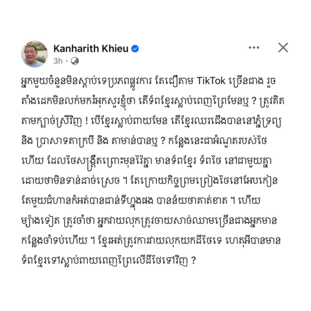 ភ្នំពេញ ៖ ឯកឧត្តម ខៀវ កាញារីទ្ធ សមាជិករដ្ឋសភា បានមានប្រសាសន៍ថា អ្នកមួយចំនួនមិនស្តាប់ទេប្រភពផ្លូវការ តែជឿតាម TikTok ច្រើនជាង រួចតាំងដេកមិនលក់មករំអុកសួរខ្ញុំថា តើទ័ពខ្មែរស្លាប់ពេញព្រៃមែនឬ ? ត្រូវគិតតាមក្បាច់ស្រីវិញ ! បើខ្មែរស្លាប់ពាយមែន តើខ្មែរឈរជើងបាននៅភ្នំទ្រព្យ និង ប្រាសាទតាក្របី និង តាមាន់បានឬ ?