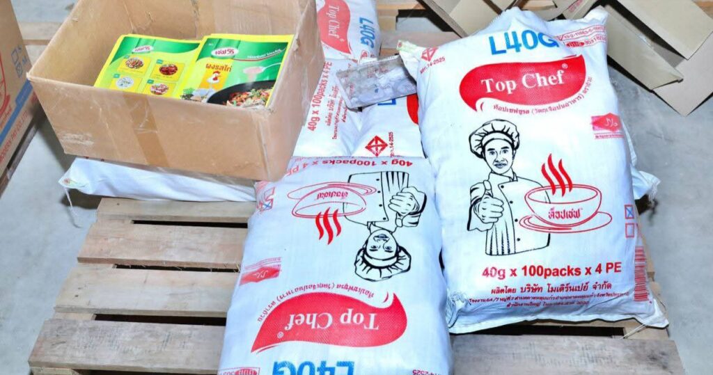 ក្នុងការឆែកឆេរត្រួតពិនិត្យជាក់ស្តែង សមត្ថកិច្ចបានរកឃើញនូវសម្ភារៈវត្ថុតាងដូចជា៖ ប៊ីចេង ម្សៅស៊ុបវេចខ្ចប់រួច រួមនឹងសម្បកថង់ សម្បកកេស សម្បកបាវ ម៉ាក ឆេហ្វ 55 ខុសច្បាប់ ប្រមាណជាង ៣០តោន, ម៉ាស៊ីនវាយកាលបរិច្ឆេទ ០១គ្រឿង, ម៉ាស៊ីនវេចខ្ចប់ធំ ០២គ្រឿង, ម៉ាស៊ីនវេចខ្ចប់តូច ០៣គ្រឿង, ម៉ាស៊ីនអ៊ុតកេស០២គ្រឿង, ម៉ាស៊ីនរ៉ៃ ០២គ្រឿង, រថយន្តដឹកទំនិញ ០៤គ្រឿង និងរ៉ឺម៉កសម្រាប់ដឹកទំនិញ ០៦គ្រឿង ។