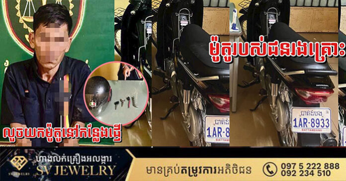 ចំពោះមូលហេតុនៃការឃាត់ខ្លួនគឺករណីលួចម៉ូតូរបស់ជនរងគ្រោះ ឈ្មោះ ស្រេង មួយសៀង ភេទស្រី អាយុ១៧ឆ្នាំ មានទីលំ នៅភូមិអូរកំ បុត ឃុំព្រែកខ្ពប់ ស្រុកឯកភ្នំ ខេត្តបាត់ដំបង កាលពីថ្ងៃទី១១ខែ សីហា ឆ្នាំ២០២៥ នៅក្នុងបរិវេណមន្ទីរពេទ្យបង្អែកខេត្តបាត់ដំបងខណ:យកម៉ូតូទៅផ្ញេីហេីយដាក់សំបុត្រផ្ញេីនៅក្រោមកែបម៉ូតូ។
